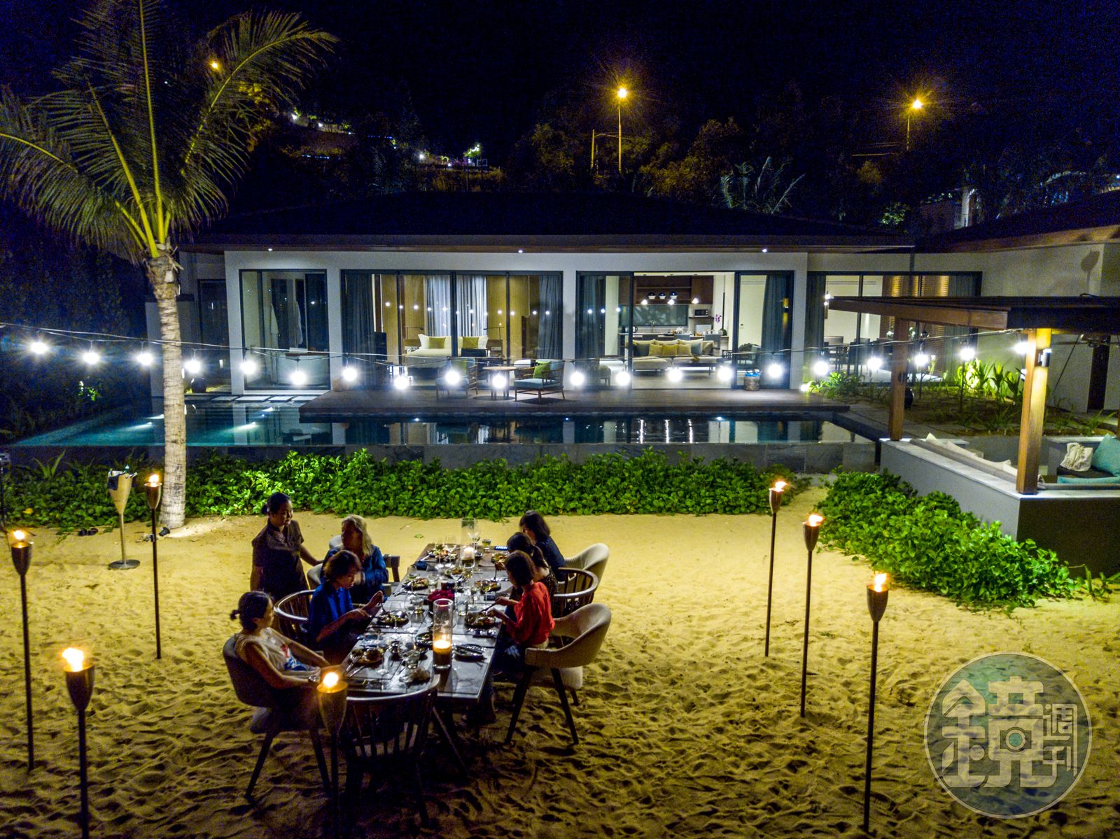 我本來不相信,這麼一個不算大的地方,能變出什麼花樣來?直到看見他們在沙灘上點起火把,又用一個個小燈構築出一條夢幻之路,由專人引領來到大石頭後面,我們眼前頓時一亮,天然的岩石成了最好的屏障,為客人創造出沙灘上的私人包廂,一道道美食熱騰騰地送到桌上,侍酒師隨侍在側,從進場的驚喜開始,一路浪漫到最後。