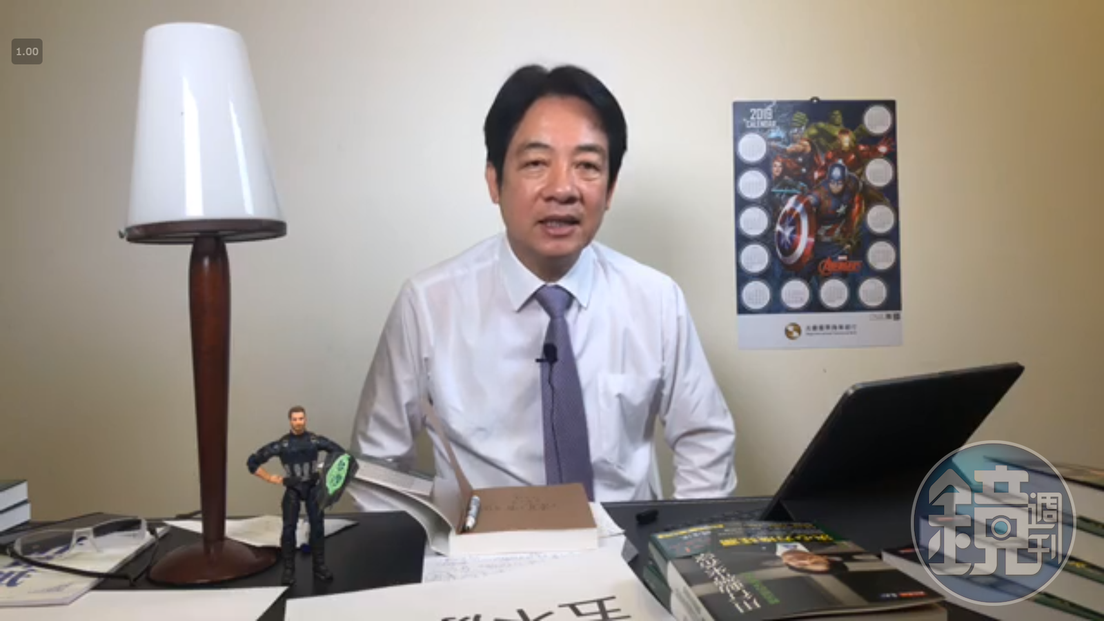 這次直播賴清德桌上放了一個美國隊長公仔,後方牆面也貼上「復仇者聯盟」年曆。賴解釋,公仔是昨天他在高雄簽書時,一位女同學製作送給他的,因為他說欣賞美國隊長這個角色,且盾牌上有台灣字樣。這位女同學希望他能帶領團隊、保護台灣。賴清德也強調,只要他能在初選中出線,「我會是很好的母雞,一定傾全力輔選立委!」