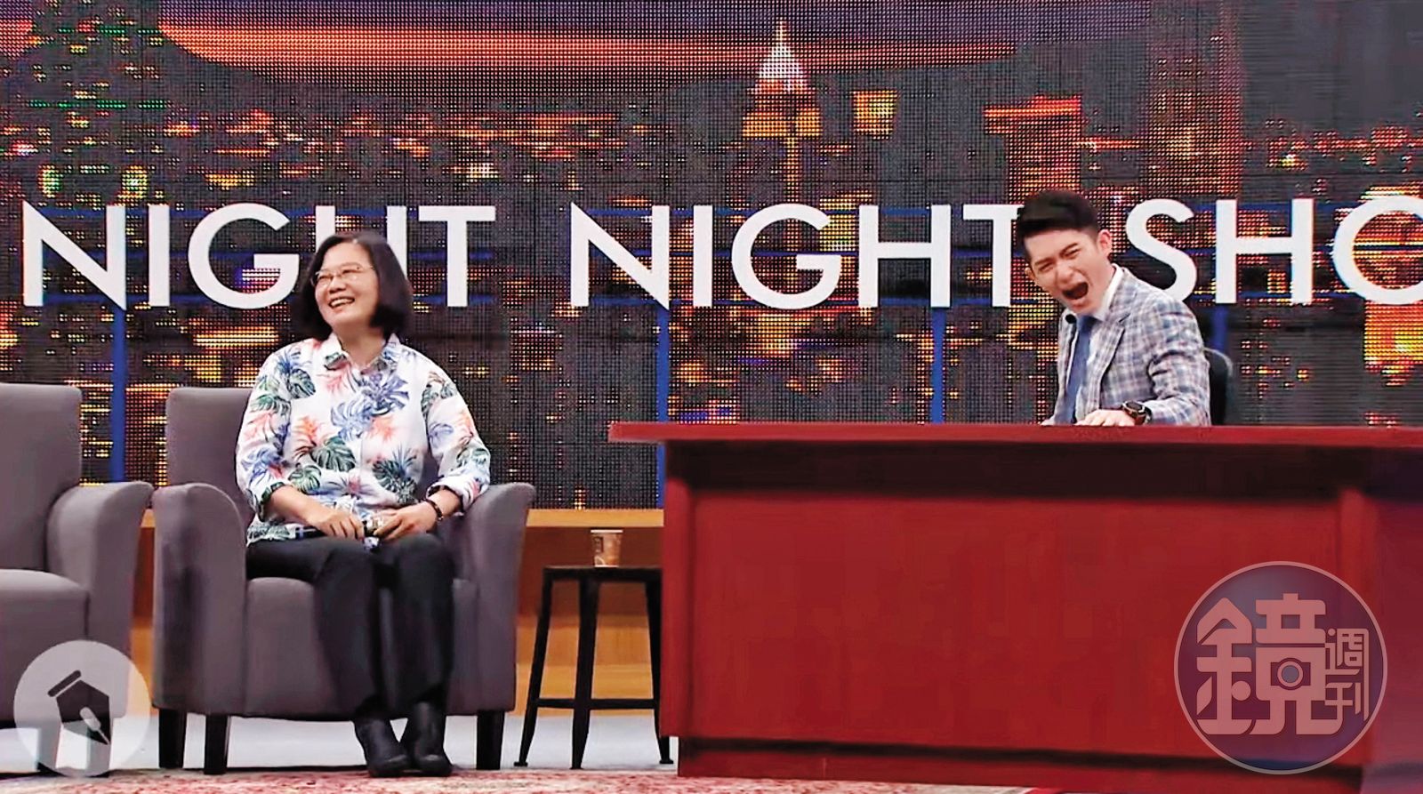 蔡英文(左)在年輕族群樹立「辣台妹」形象,圖為她上網路脫口秀節目《博恩夜夜秀》。(翻攝博恩夜夜秀)發布時間:2019.04.30 06:58 臺北時間