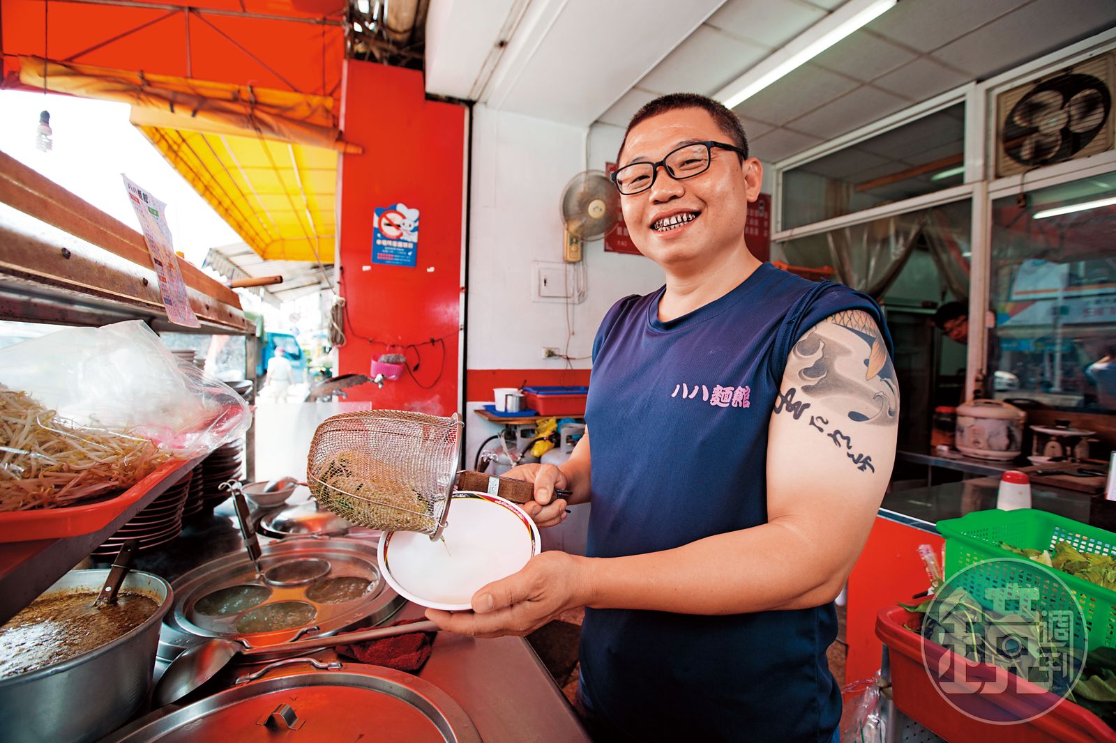 「我都自己跑菜市場,我喜歡那個環境。」孔豐吉的個頭不高,一身肌肉壯碩結實,逢人就開玩笑,笑起來眼睛幾乎瞇成一條線,邊備料邊招呼我們。中午時分,客人陸續上門,他捲起袖子站在兩口大鍋子前,熟練地煮麵、下水餃,熱氣翻湧間,隱約露出臂膀上斑斕的刺青。
