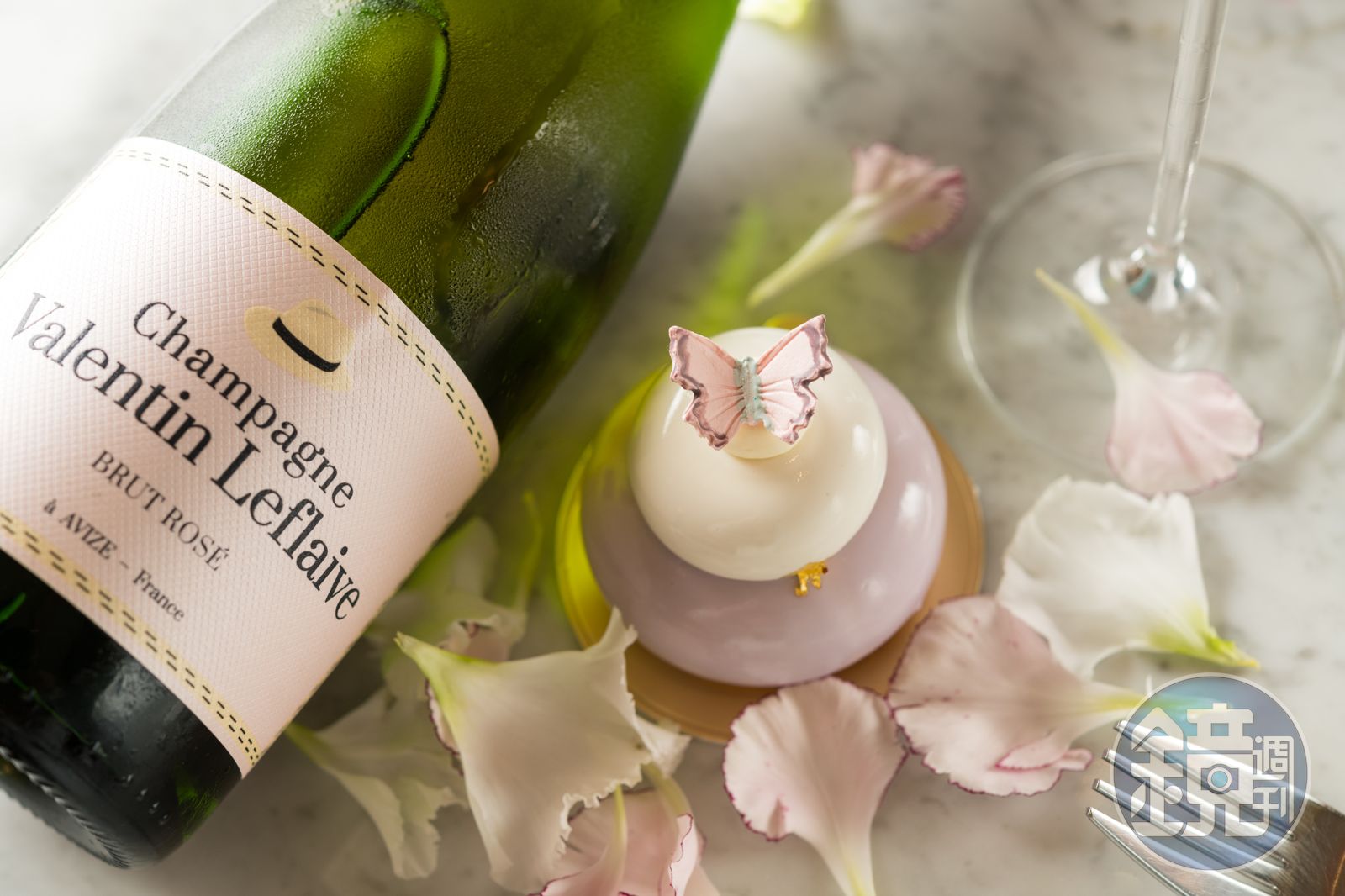 面對Hin熱愛用台灣茗茶入甜點,像是茶味隱約細緻的優雅系蛋糕「東方美人」,Sean則端來乾淨明亮,酒體飽滿但不具侵略性的「Valentin Leflaive, Brut Rosé」因應,香檳酒香對上茶香甜點,互不干擾,還延續了悠長的茶香尾韻。