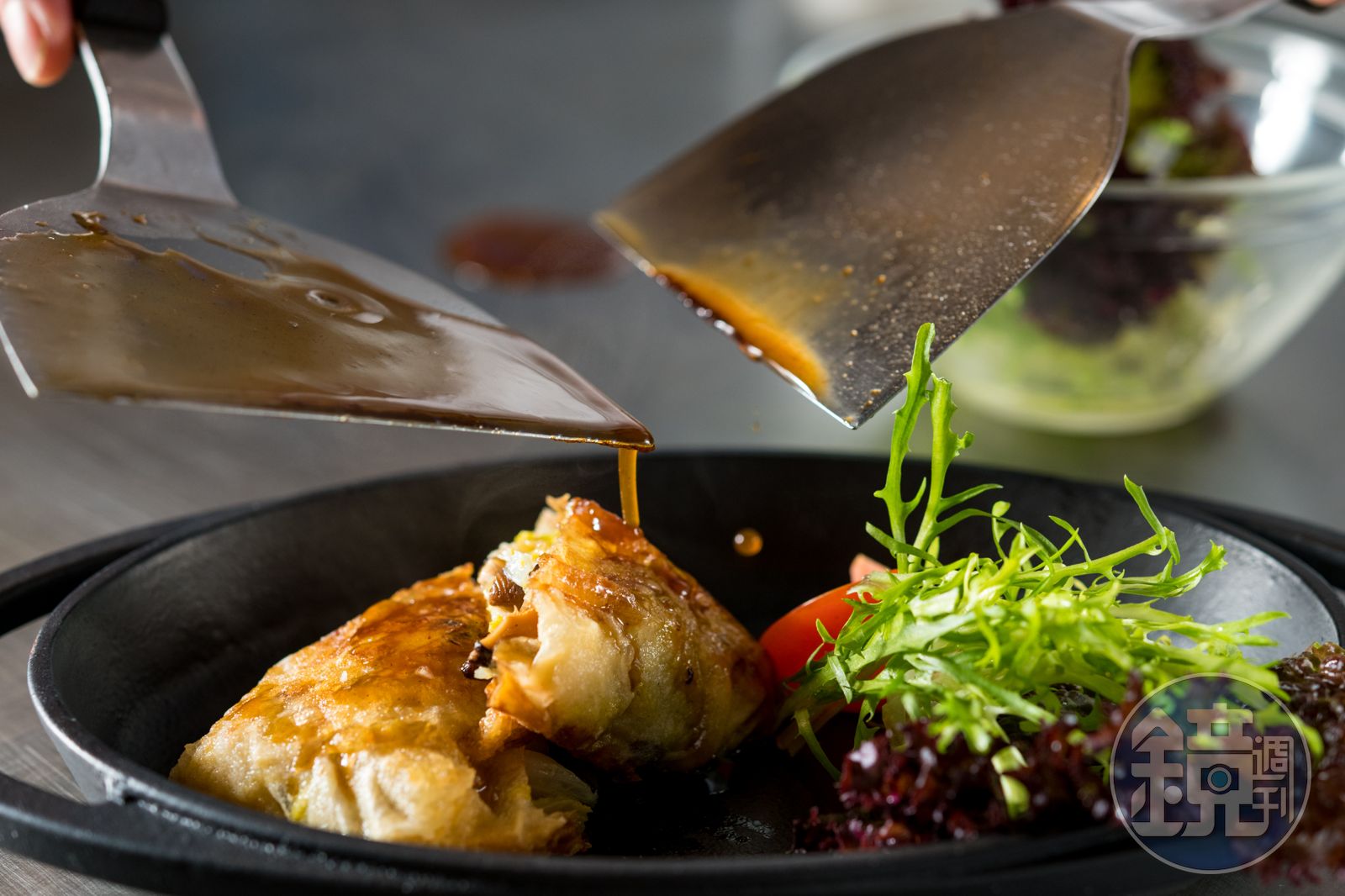 主廚在「金鑲白玉果」上展現刀工,將冬瓜削成薄片再捲著豆腐,上鐵板把底部煎出焦香,再淋上用破布子和素蠔油煮成的醬汁提味,口感外脆內軟,香甜有味。「福茹豆蔬捲」則是用腐皮包著娃娃菜和香菇,把兩面煎到焦酥,淋點大阪燒醬,吃得到豆香和蔬菜的鮮脆甜美。