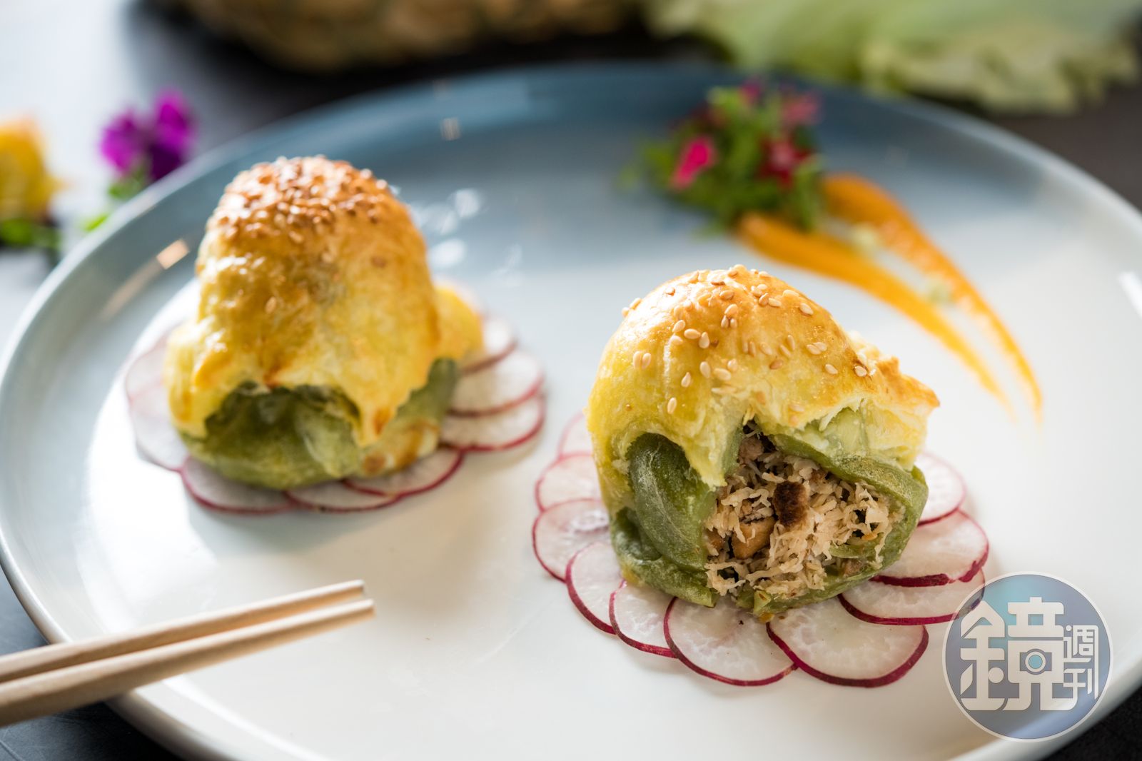 為了吸引年輕人,主廚廖本寒特別著重在料理形色上的表現,好比「舒爽鄉村食農麵線」,每次吃到的麵條顏色可能都不同,除了原味白色,還會用甜菜根染成粉紅色,或用藍草做成粉藍色,煮熟後還要冰鎮一整晚,讓麵條更彈Q,搭配蘋果泥和薑末調成的和風醬、小番茄和黃瓜絲,吃起來沁涼爽口很開胃。