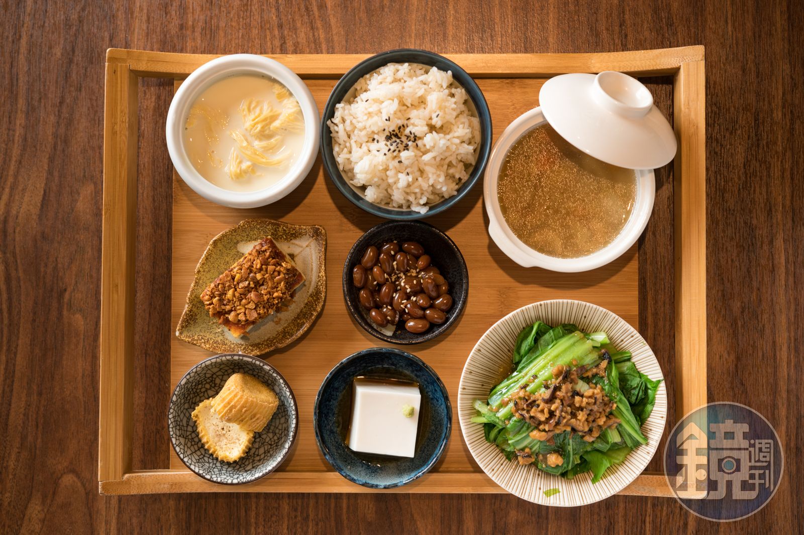 葛根豆腐是用葛根粉加腰果、花生製成,實際上不含黃豆,純粹因形似而得名,質地綿滑有花生香;蜜黃豆則是用麥芽糖加冰糖炒出蜜甜糖衣。另外還會附上燙青菜、養生湯盅和白飯,飽度剛好。