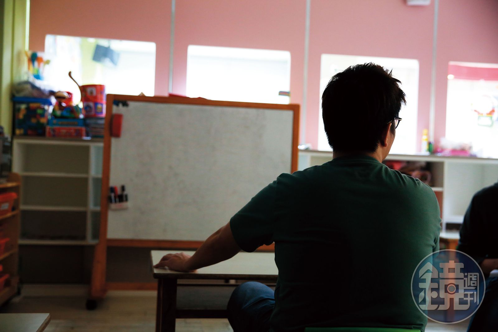 一名男子手拿貼有議會貼紙(藍圈處)的平板電腦,跟拍楊先生安親班的學童隊伍,被發現後,男子向警方供稱自己是公民記者。(讀者提供)楊先生堅定地說:「今年議會開議後,李依舊把我當成眼中釘,我決定結束營業,把事情一次攤開來講,讓社會公評!」