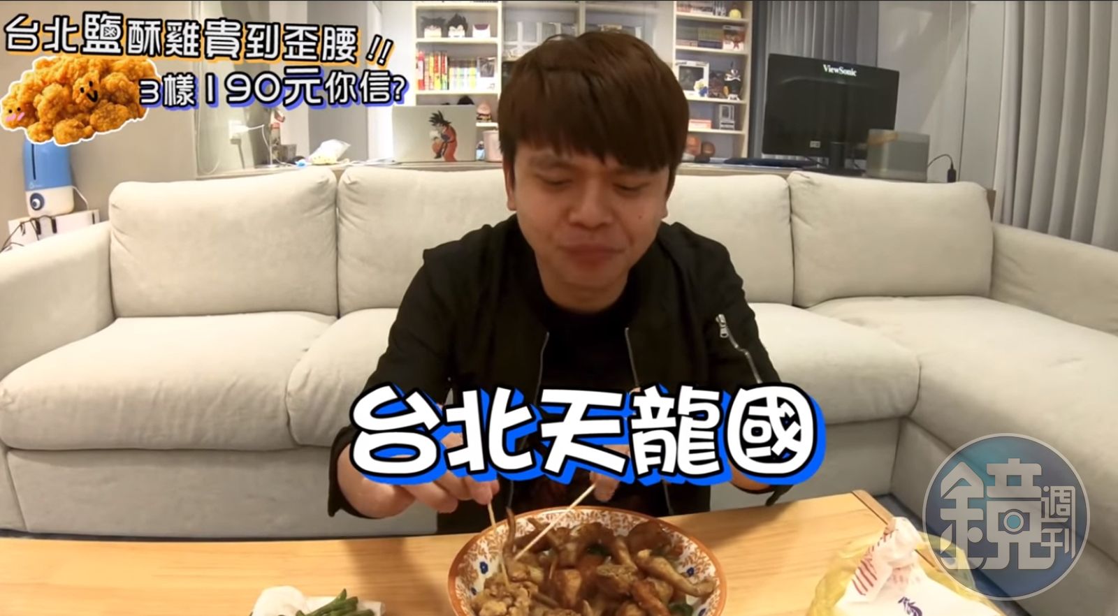 台灣知名YouTuber蔡阿嘎6日發布新影片,片中他到北投一家沒去過的鹽酥雞店,共買了魷魚、肉和四季豆3樣炸物,其中魷魚和肉各65元,蔡阿嘎覺得價錢還能接受,但是小份四季豆60元卻讓他嚇到歪腰,大喊台北天龍國,出身北港的老婆「二伯」也說在故鄉30、50元就能買到魷魚,要蔡阿嘎不要亂花錢,兩人還有房貸要付。