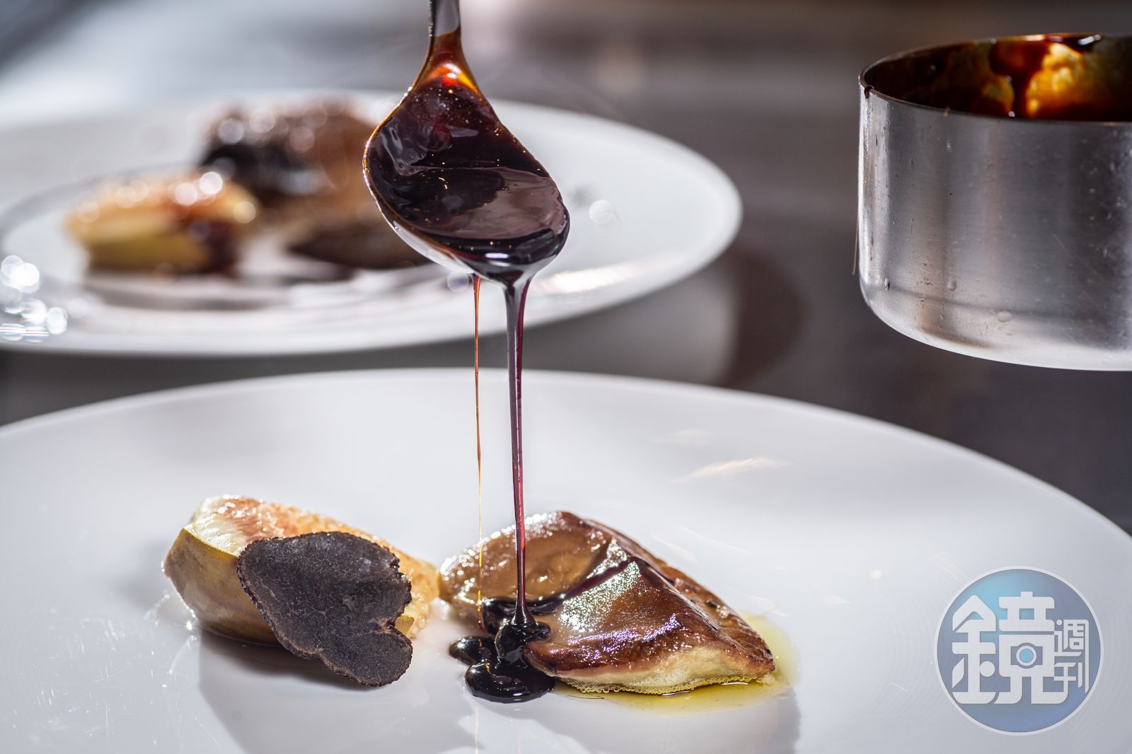 例如香煎鴨肝佐的深色波特醬,得費上一週準備,是2瓶30年的波特酒和1瓶X.O.,加上老母雞、牛筋、牛肉、牛骨分別熬成的4鍋高湯濃縮而成,極陳極美的集大成,反而更能彰顯所有食材的鮮與甜。據說一口醬汁成本就要數百元,簡直是一匙入魂,醬汁都比主角珍貴了。