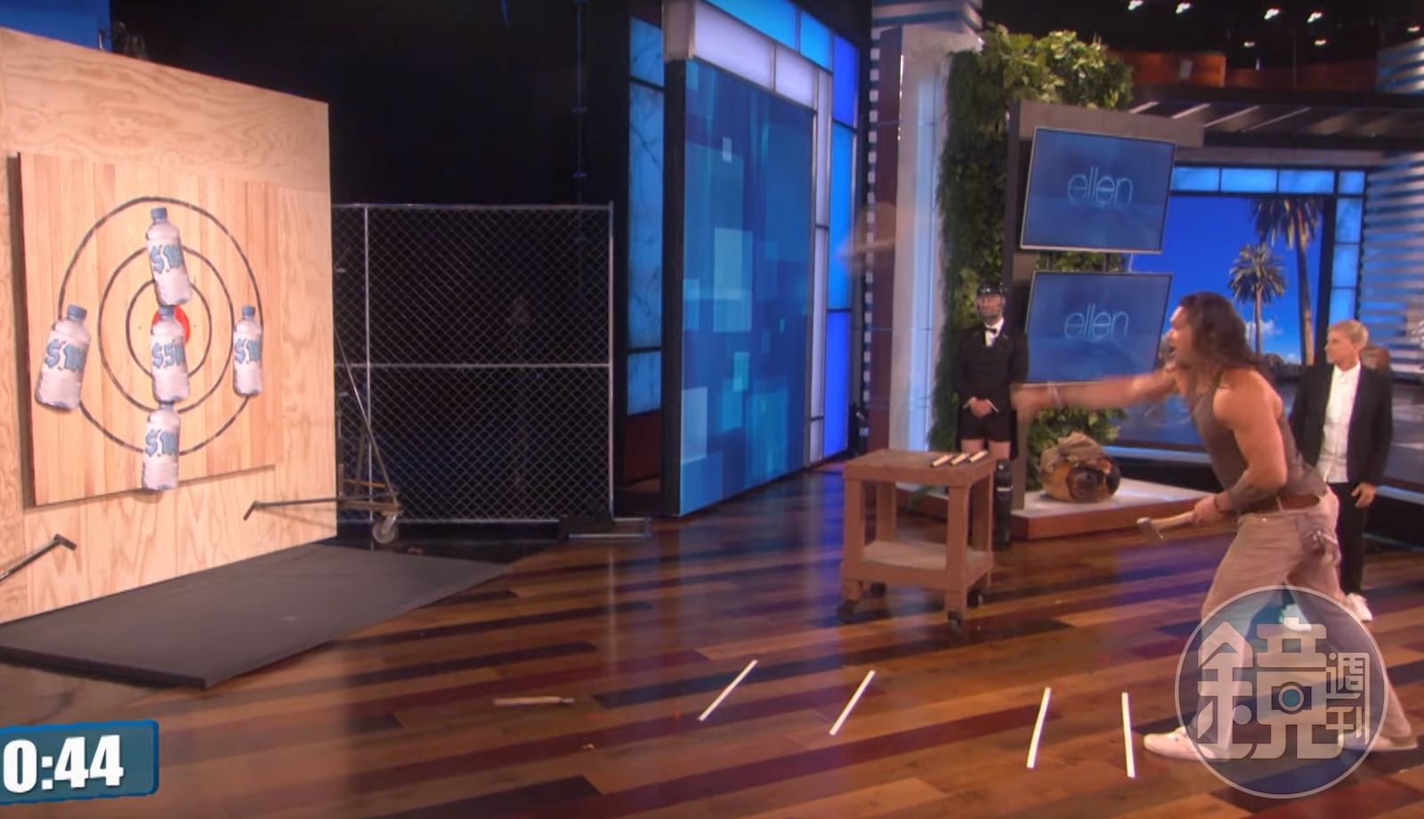 除了談自己對環保的理念之外,傑森摩莫亞更在節目裡大顯身手,挑戰丟「真斧頭」替環保組織募款,只見傑森摩莫亞脫去外套,露出結實身材讓現場觀眾為之瘋狂、瘋狂尖叫,主持人艾倫(Ellen)表示,只要傑森摩莫亞丟中一個寶特瓶,製作單位就會捐出被集中寶特瓶上印有的金額給夏威夷環保組織「永續經營夏威夷海岸線」(Sustainable Coastlines Hawaii)。