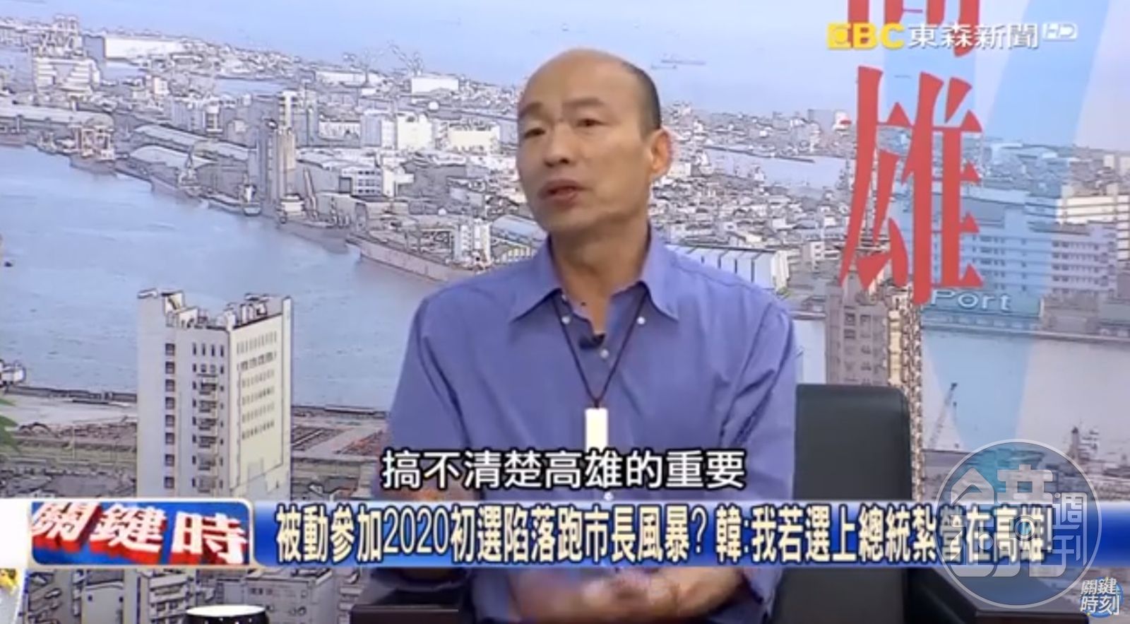 韓國瑜表示,總統府在高雄本來就有辦公室,因此總統在高雄上班完全沒有問題。主持人劉寶傑提問,若當選總統後在高雄上班,會不會只是偶爾來一下,韓國瑜則回答,若他當選,會「紮營」在高雄,自己老家在雲林,不管在台北或高雄上班都沒有差別,生活跟之前沒有差別。