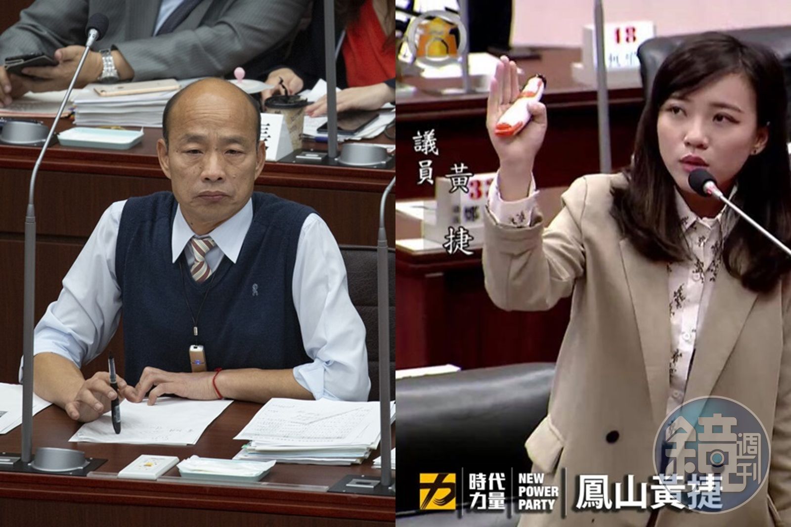 質詢高雄市長韓國瑜「一翻成名」的時代力量議員黃捷,今再次於高雄市議會質詢韓國瑜,昨(14日)黃捷不僅先在自己的粉絲專頁上洩題,要韓國瑜市府團隊認真準備充足;今日上場長達50分鐘質詢,黃捷依序點名多位局處長起來答覆,就是沒有點名韓國瑜市長。會後黃捷表示,打給總機都要轉給分機,既然知道分機號碼,就直接打分機就好,不要浪費市民和自己的珍貴時間。