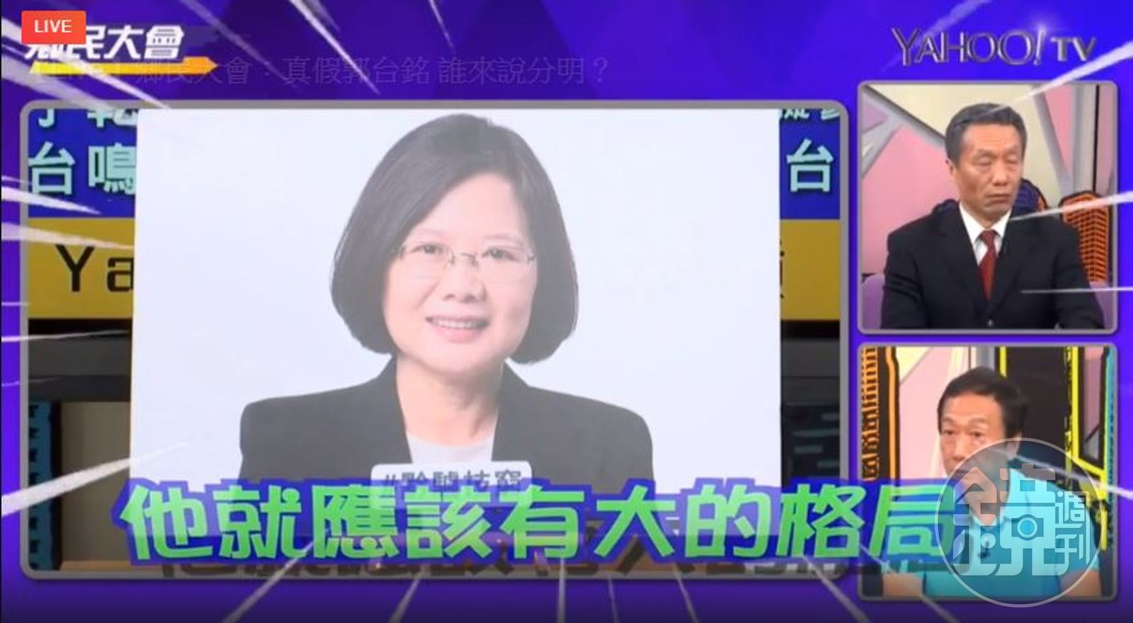 郭董在Yahoo TV《鄉民大會》節目上大玩貼標籤遊戲,以自己的角度看現在各路人馬的總統擬參選人,他形容朱立倫是「時不我與」,郭台銘解釋說並非是朱行政能力不足,只是因應現今時下的經濟趨勢,相信自己是更好的選擇。對於郭子乾說,若是朱立倫最後出來選,郭台銘也承諾願意出來擔任行政院長協助國家經濟發展。