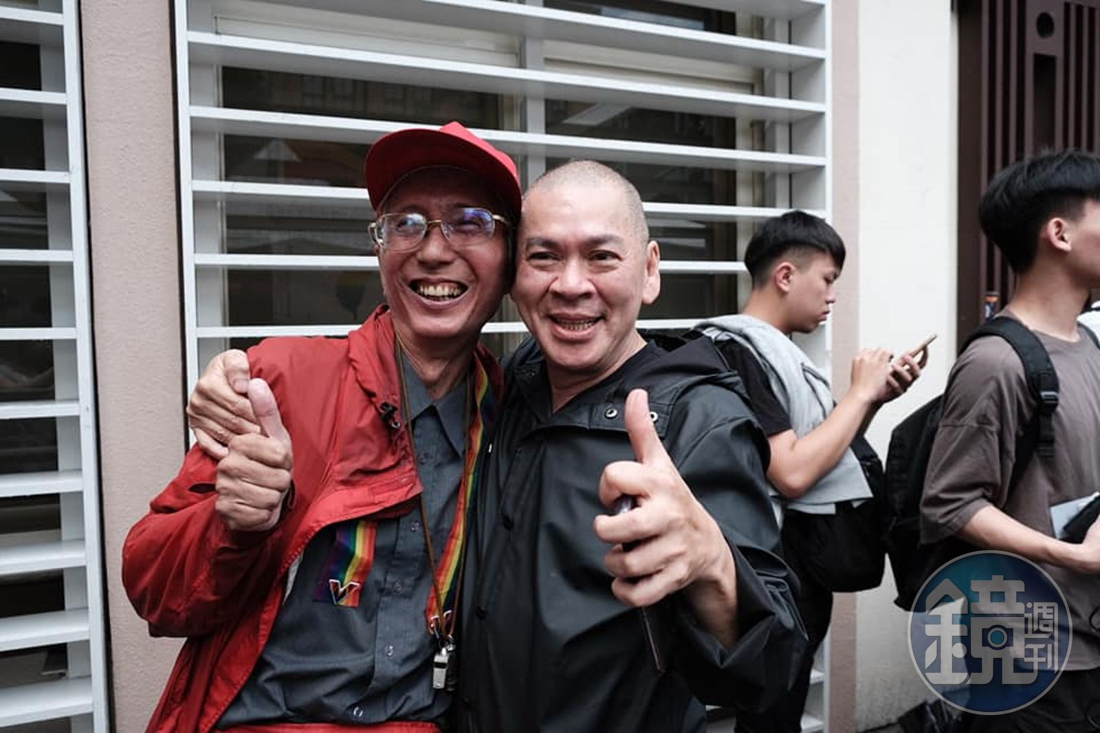 導演蔡明亮下午現身青島東路上的挺同現場,和台灣彩虹老將祈家威(左)相擁。(翻攝自蔡明亮臉書)發布時間:2019.05.17 17:29 臺北時間