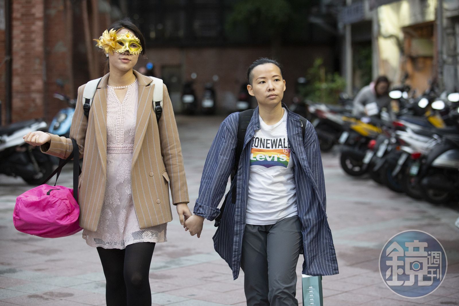 受訪時厭世姬戴起華麗巴洛克風格的面具,不戴的時候,她看起來就是時髦都會女子,在公關公司當上班族,下班去練拳擊、做重訓。2人認識的起因,是她去年10月在作家林立青的臉書上看到簡莉穎的照片,直呼很帥、想認識,作家好友李屏瑤立刻約好飯局,把簡莉穎帶去厭世姬家做客,2人曖昧了一小段時間,個性單刀直入的簡莉穎挑明問她:「我們是在曖昧嗎?妳可以喜歡女生嗎?」厭世姬回答,自己高中時有過喜歡女生的經驗,只是過去交往的都是男朋友。
