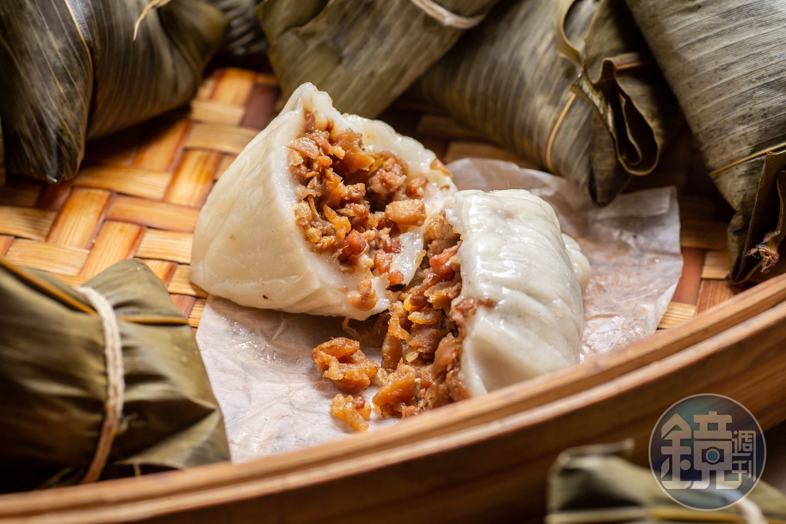 這家的粽子一哥稱號,要頒給「客家粿粽」,阿姨熟練地將油亮的粿糰放入掌心壓凹,包進菜脯、魷魚、乾蝦仁及肉絲,捏緊塞進粽葉炊蒸,放涼吃,粿皮Q勁十足,餡料鮮香不死鹹,皮和餡的比例拿捏得宜,愈嚼愈香。南北粽選用黑豬肉的瘦肉和三層肉,包進菜脯、乾蝦仁、香菇,人氣也很高。