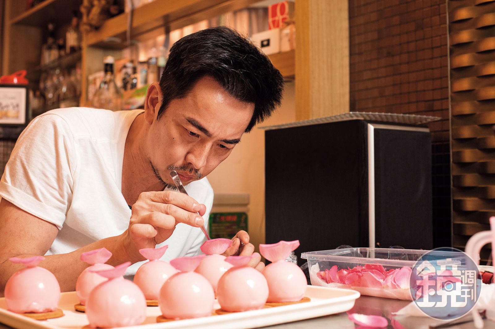 週六早上8點,距離營業時間倒數5小時,西菲斯老闆Rico小心翼翼地用鑷子把玫瑰花瓣擺在粉色半圓鏡面蛋糕上,「蛋糕是圓的,用10點鐘或2點鐘的角度斜放可以拉長視覺效果,感覺起來才會瘦長漂亮。」細細微調,Rico的「視界」裡,甜點不能失了美感。再點綴幾片銀箔,令人怦然心動的「初戀」粉嫩登場。