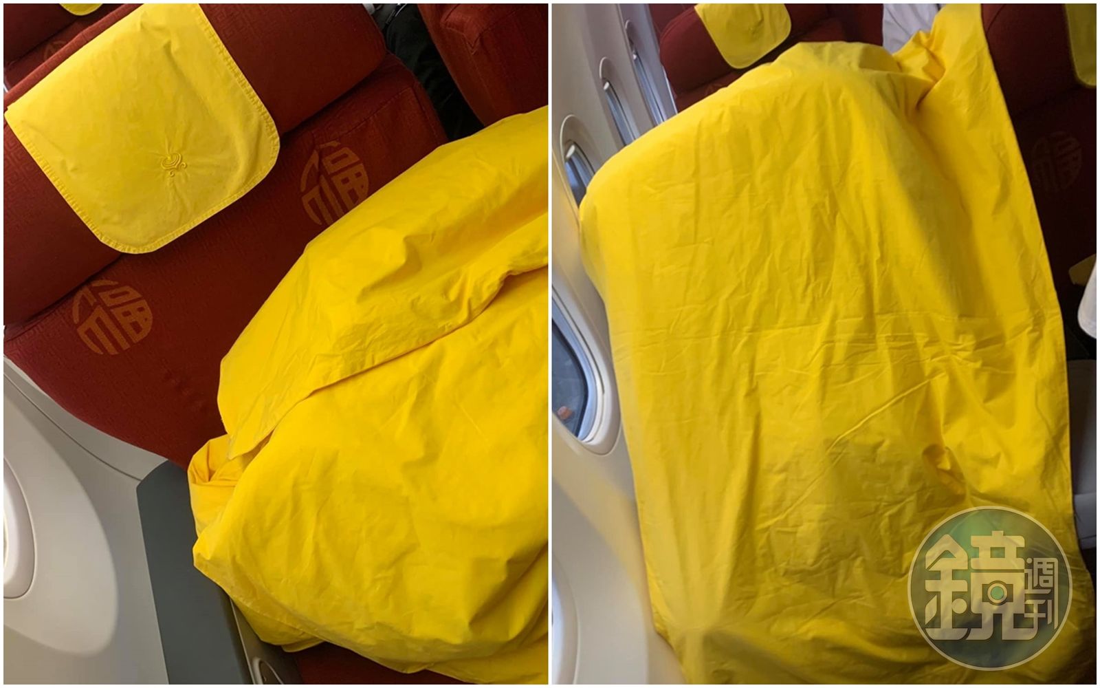 就連睡著時空姐還幫忙蓋上這條棉被,讓原po瞬間嚇醒,「#我真的覺得我要被推去燒了。」(翻攝自爆料公社)有名女網友搭乘商務艙遭遇「往生體驗」,讓她崩潰在《爆料公社》po文,直呼飛機上「棉被顏色真的要慎選」,除了紅色椅背上的福字搭配黃色的棉被,讓原po難以接受外,就連她睡著時空姐還貼心幫忙蓋上這條棉被,讓原po瞬間嚇醒,「#我真的覺得我要被推去燒了。」