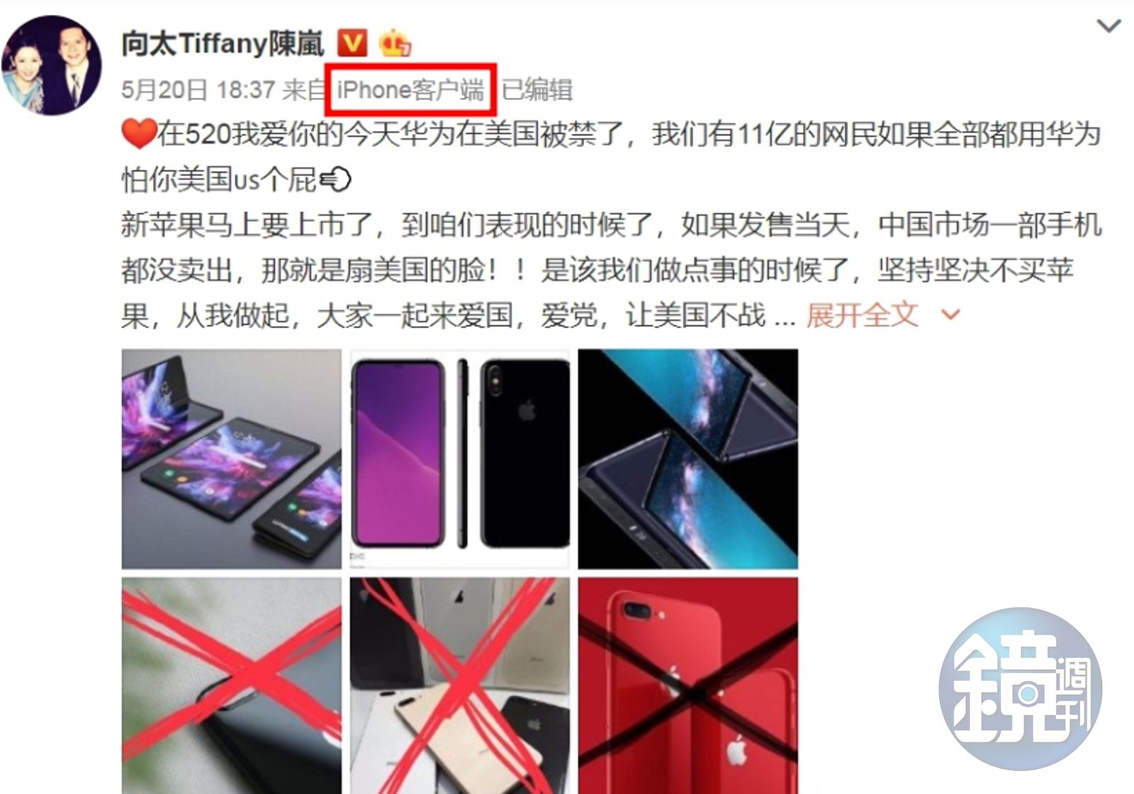 「向太」陳嵐5月20日當天在微博上,為美國封殺華為一事表達強烈不滿,「在520我愛你的今天華為在美國被禁了,我們有11億的網民如果全部都用華為怕你美國🇺🇸個屁」。向太表示,蘋果新機將上市,若是在發售當天,中國一部手機都沒賣出,就等於是搧美國的臉。
