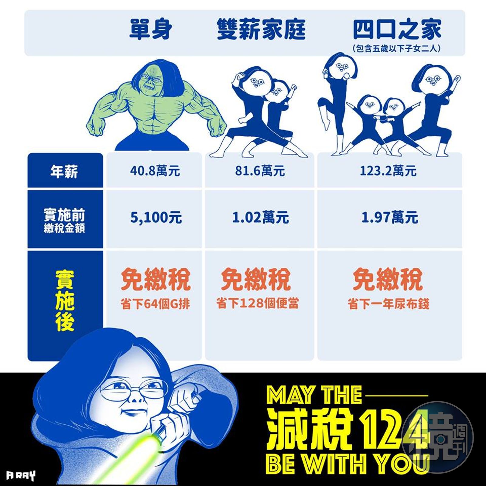最終版本在得到蔡英文同意可張貼後,沒想到最後A RAY還是另外以尤達大師、浩克和超人特攻隊形象,為今年減稅政策製作出一張簡潔易懂的宣傳圖,讓網友大爆笑忍不住瘋傳,並要A RAY不要玩總統。