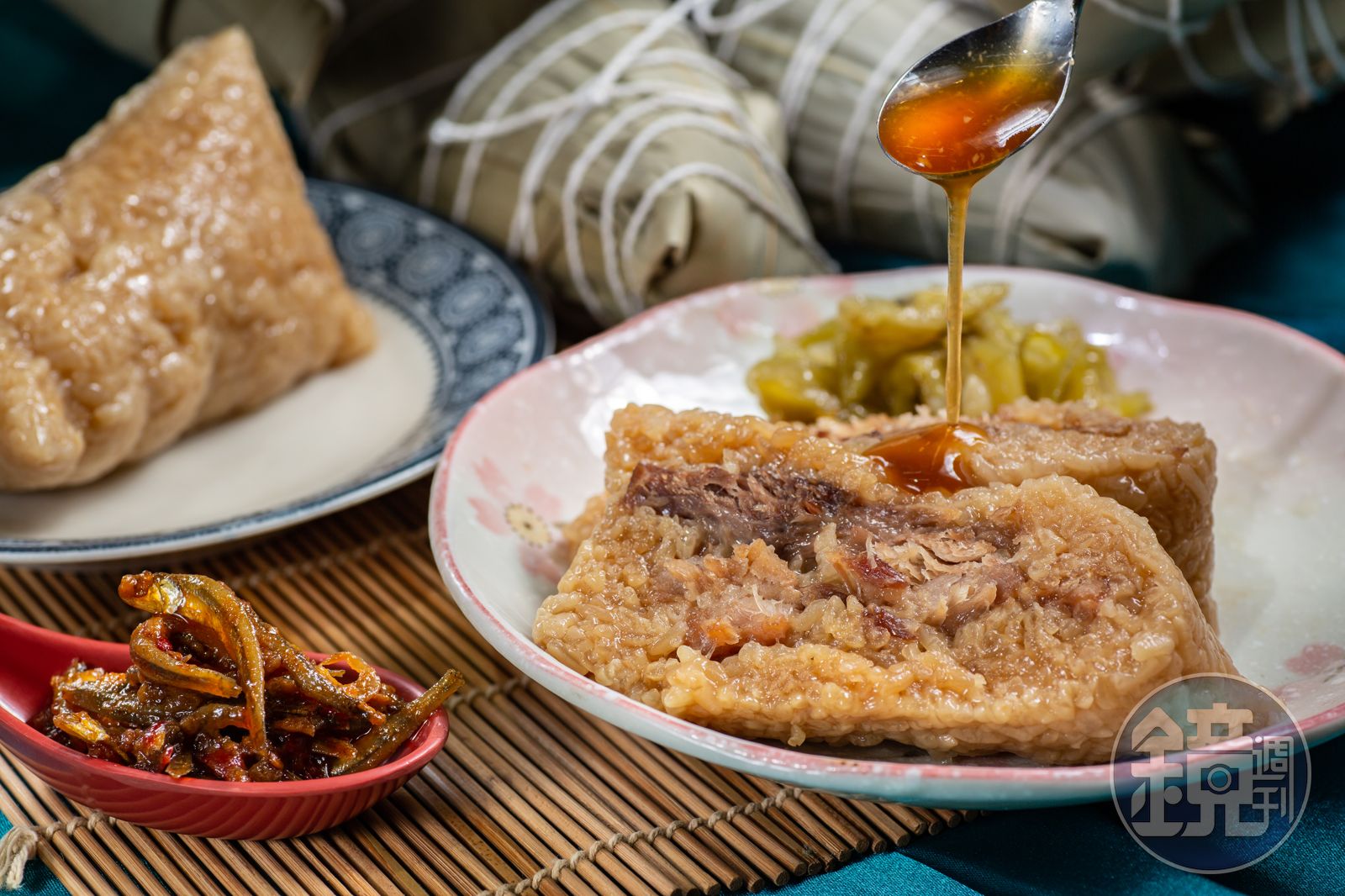 端午節前1個月限定,只提供預約訂購的「湖州豆沙粽」,紅豆泥包裹豬油,水煮後,油脂與紅豆泥融在一起,「吃起來更香,不會澀。」老闆娘跑過來補充:「有客人買回家,愛配酸菜一起吃,鹹甜鹹甜。」好多客人敲碗要老闆單賣酸菜,「做不來啦!」老闆搖搖手說。想體會奇妙滋味,甜粽到手後,記得自備酸菜加料。