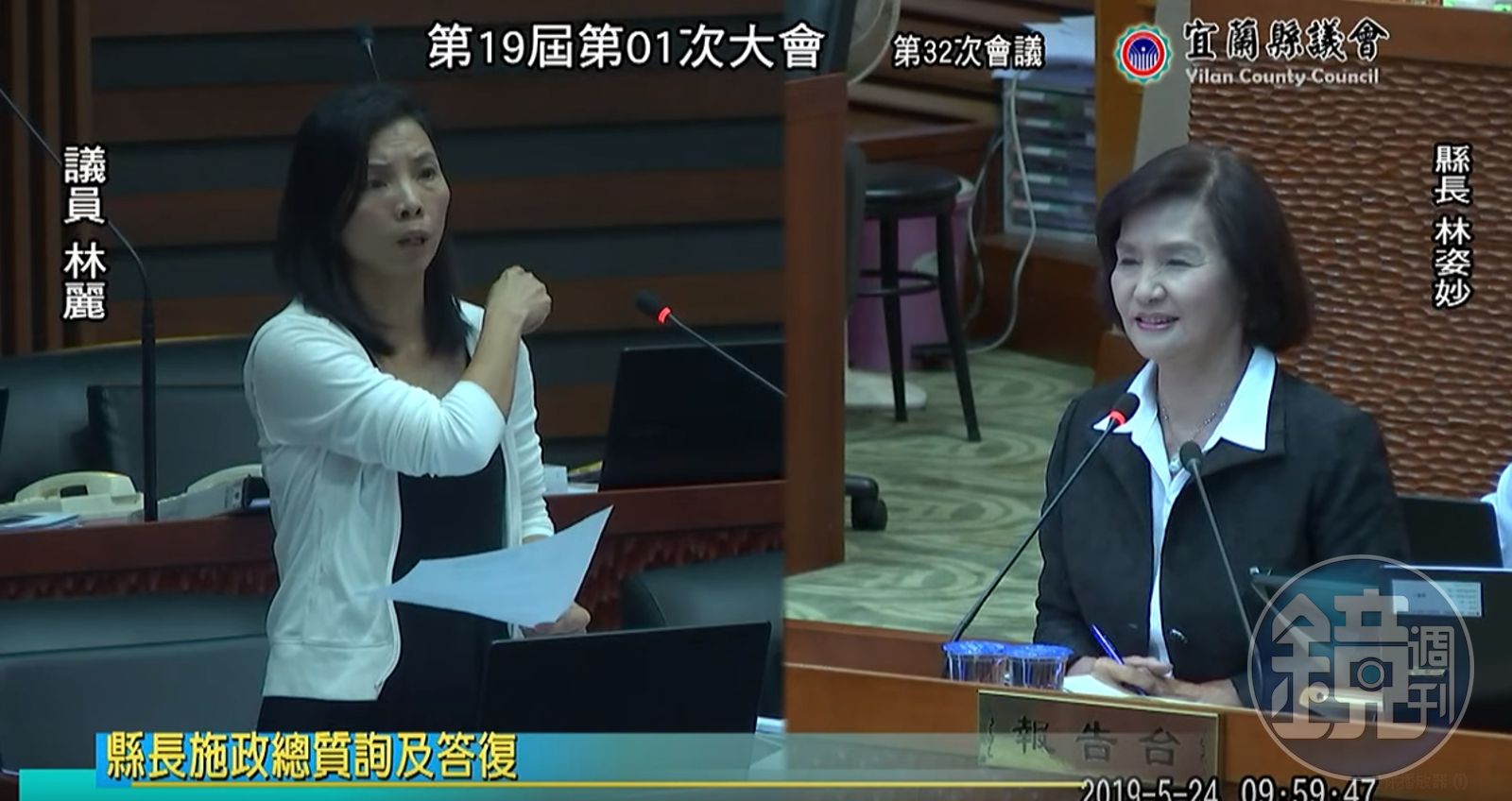 林麗又重複了兩次「蘭青庭、是蘭青庭」,林姿妙沒有回應,林麗接著解釋,蘭青庭設在宜蘭科學園區,縣長應該要整合勞工處和工商旅遊處,才能讓青年謀合創業和就業。