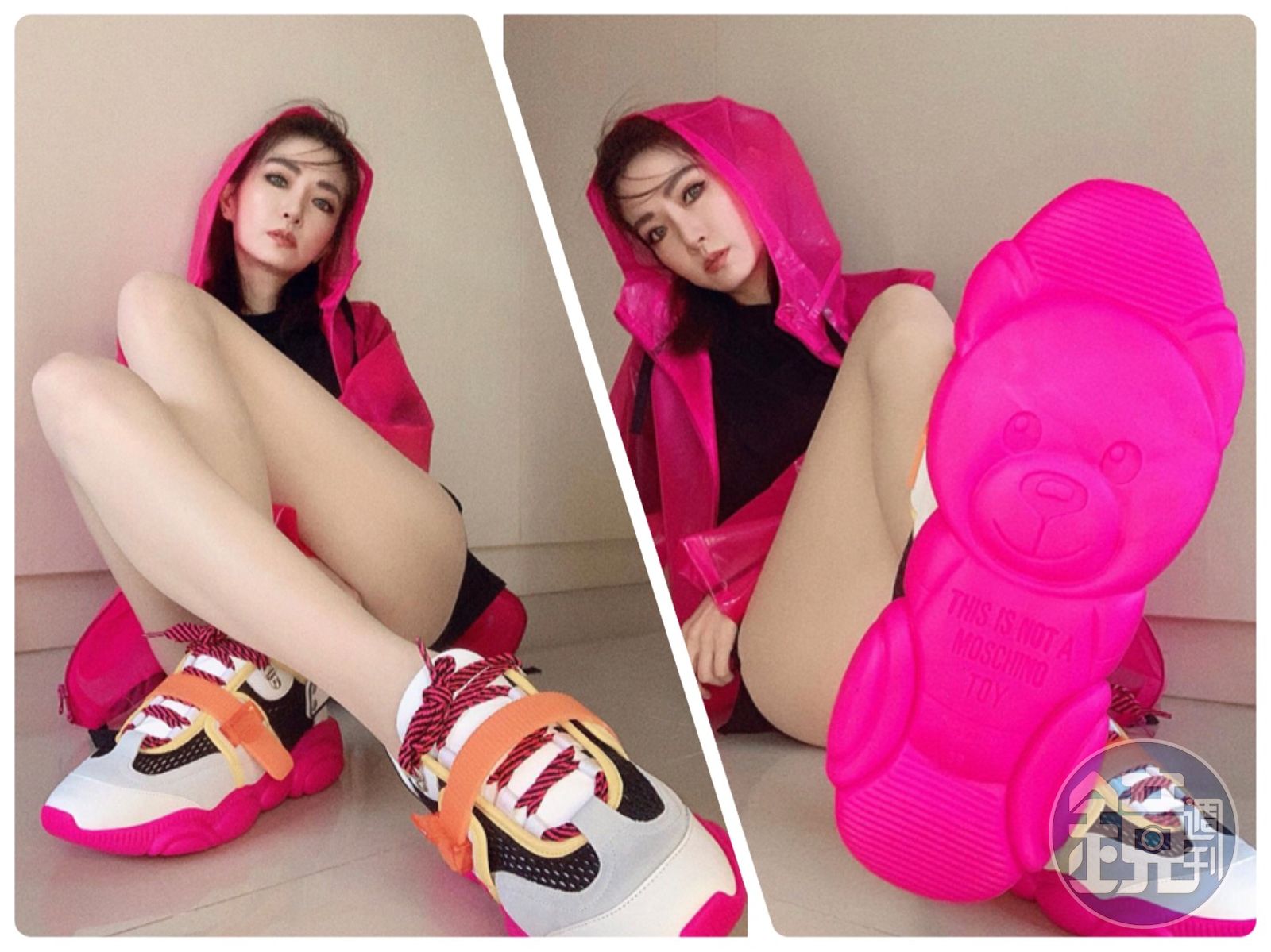 謝金燕有多喜歡這雙鞋?從她一口氣發出9張與泰迪運動鞋合影的照片可以看出端倪。照片中的她,為搭配鞋底的螢光粉,換穿了一件同色系的PVC材質雨衣外套,展現她最出名的一雙長腿,也秀出超可愛的熊鞋底。