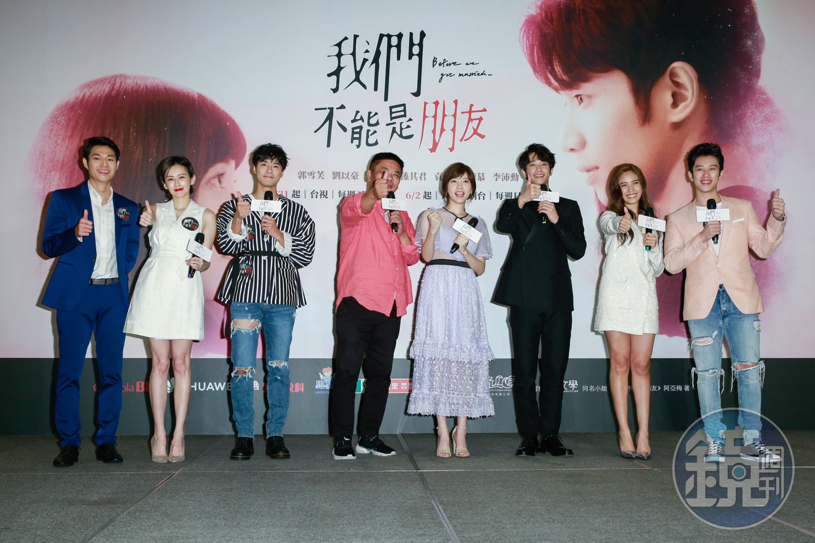 偶像劇《我們不能是朋友》今(28日)舉行首映記者會,演員劉以豪、郭雪芙、孫其君、袁艾菲、夏若妍、陳慕、李沛勳和導演馮凱及鏡文學董事長裴偉以及八大高層們一同出席。《我們不能是朋友》故事內容描述郭雪芙飾演的周惟惟將與穩定交往的男友(孫其君飾)步入禮堂, 卻在此時遇見劉以豪飾演的褚克桓。 這個男人強勢霸道地闖入惟惟的腦海,從此再也無法刪除乾淨。但彼此身邊都有論及婚嫁的對象,他們究竟應該是情人或是朋友?還是連當朋友都不可以?!該劇將在5月31日起每週五晚間10點於台視播出。6月2日起每週日晚間8點在八大戲劇台播出,另從6月9日起每週日晚間9點30分於八大綜合台線上播出。