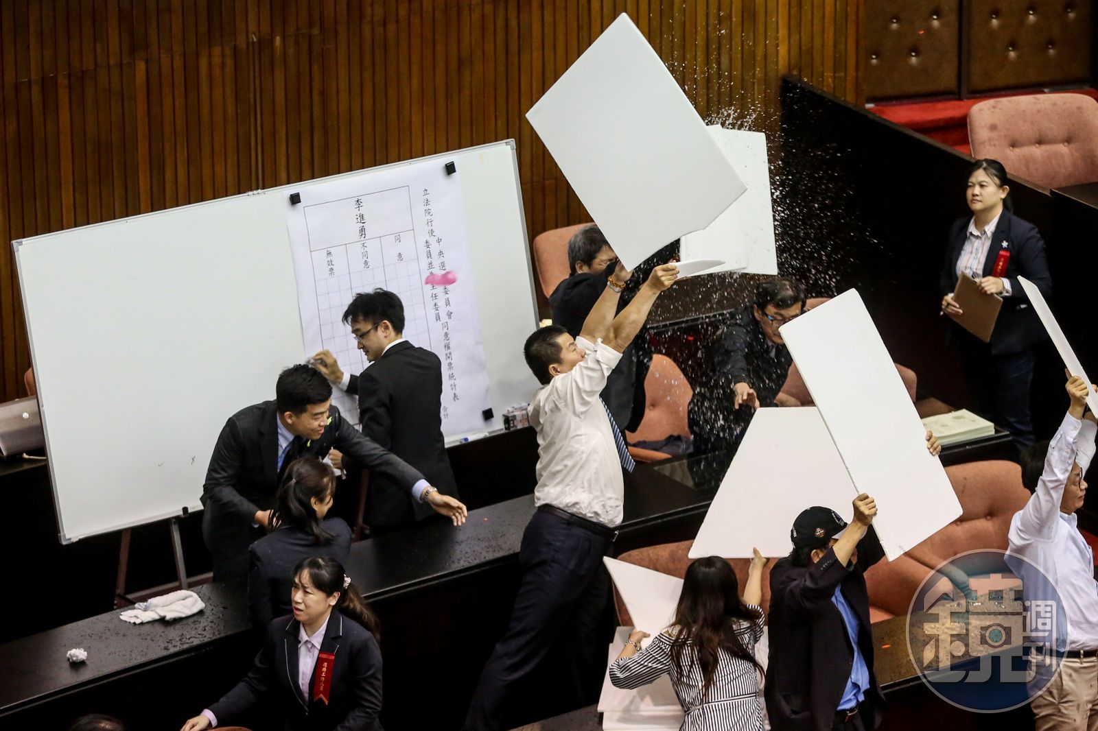 在蘇嘉全身旁的綠委施義芳手持國民黨的標語看板阻擋水球,開票處的議事人員也都舉起看板、脫下西裝防止水球攻擊,並且繼續開票。綠委李俊俋、吳秉叡、蘇震清等人則試圖搶奪藍委夾帶進場的水球,與林為洲、無黨籍立委陳玉珍等人發生推擠、拉扯。