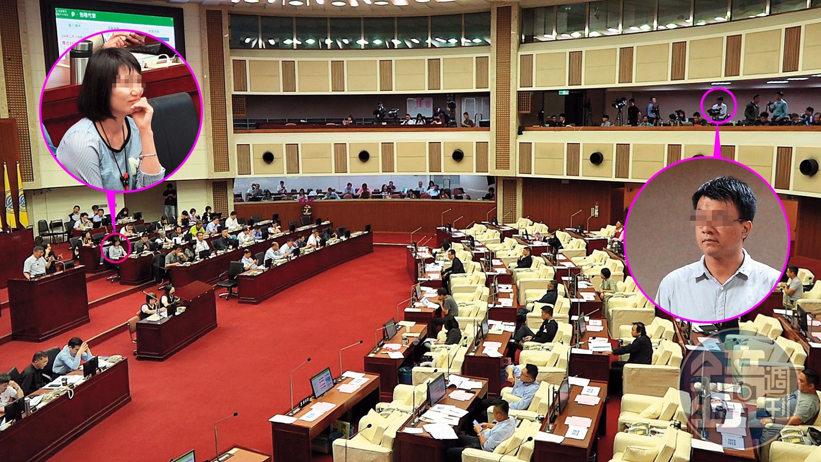 女幕僚坐在離柯文哲最近的幕僚席,男科長則坐在女幕僚後方,中間隔了2排桌椅。柯結束報告後,接受議員質詢遇到問題,女幕僚立刻上台遞資料,十分專心盡責。