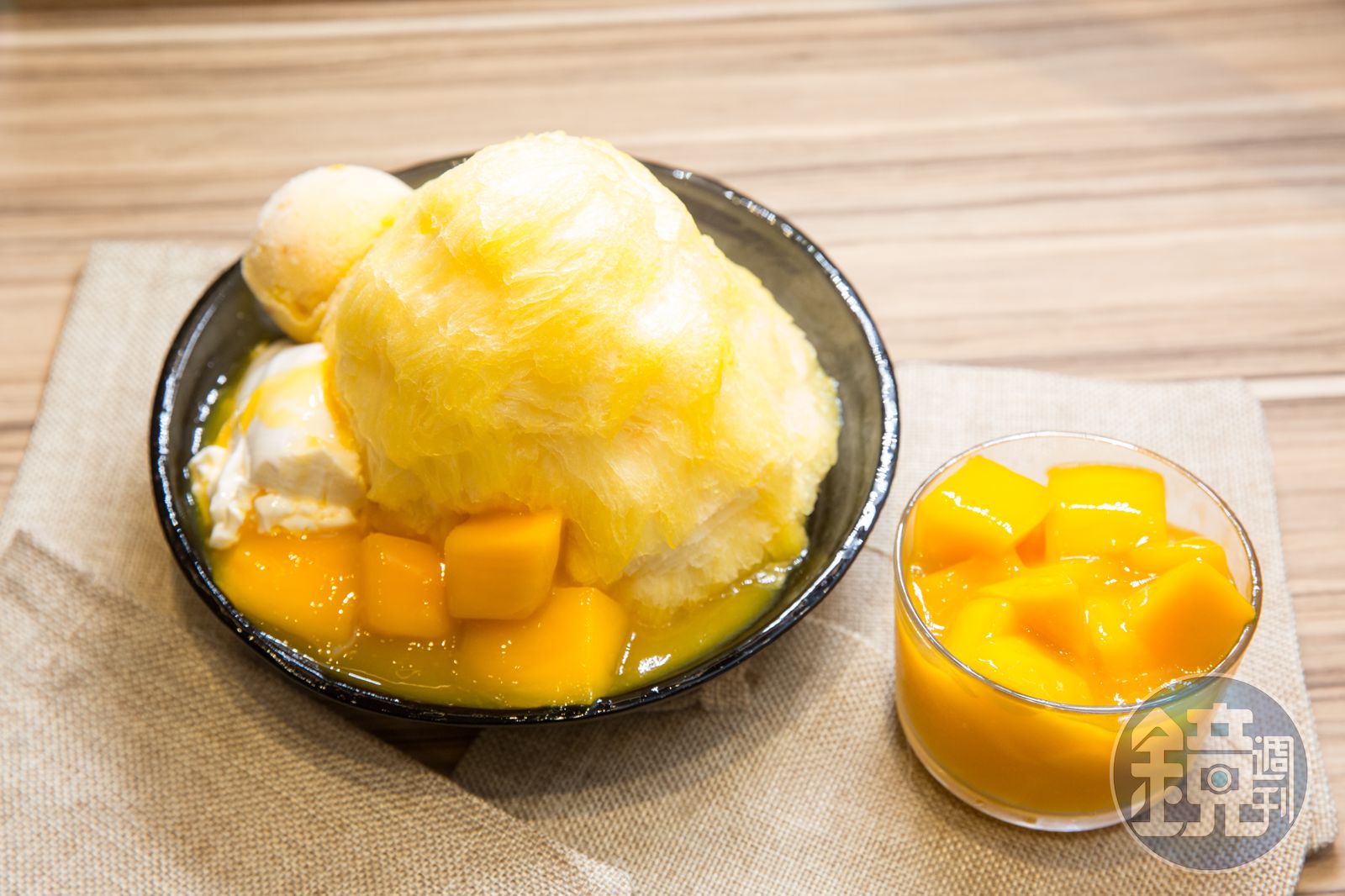 芒果產季短,ICE MONSTER會挑漂亮、熟度較高的果粒做呈盤,羅駿樺透露從老農民身上學到挑選芒果甜度的撇步,會先準備一大桶水,把芒果都倒進水裡,越往下沉的芒果,代表其糖分含量較高。當令水果最美味,羅駿樺除了芒果冰磚可全年供應外,他堅持呈盤水果只使用當令鮮果,春天推出屏東網室香瓜、夏天是芒果、冬天則有草莓等選擇。