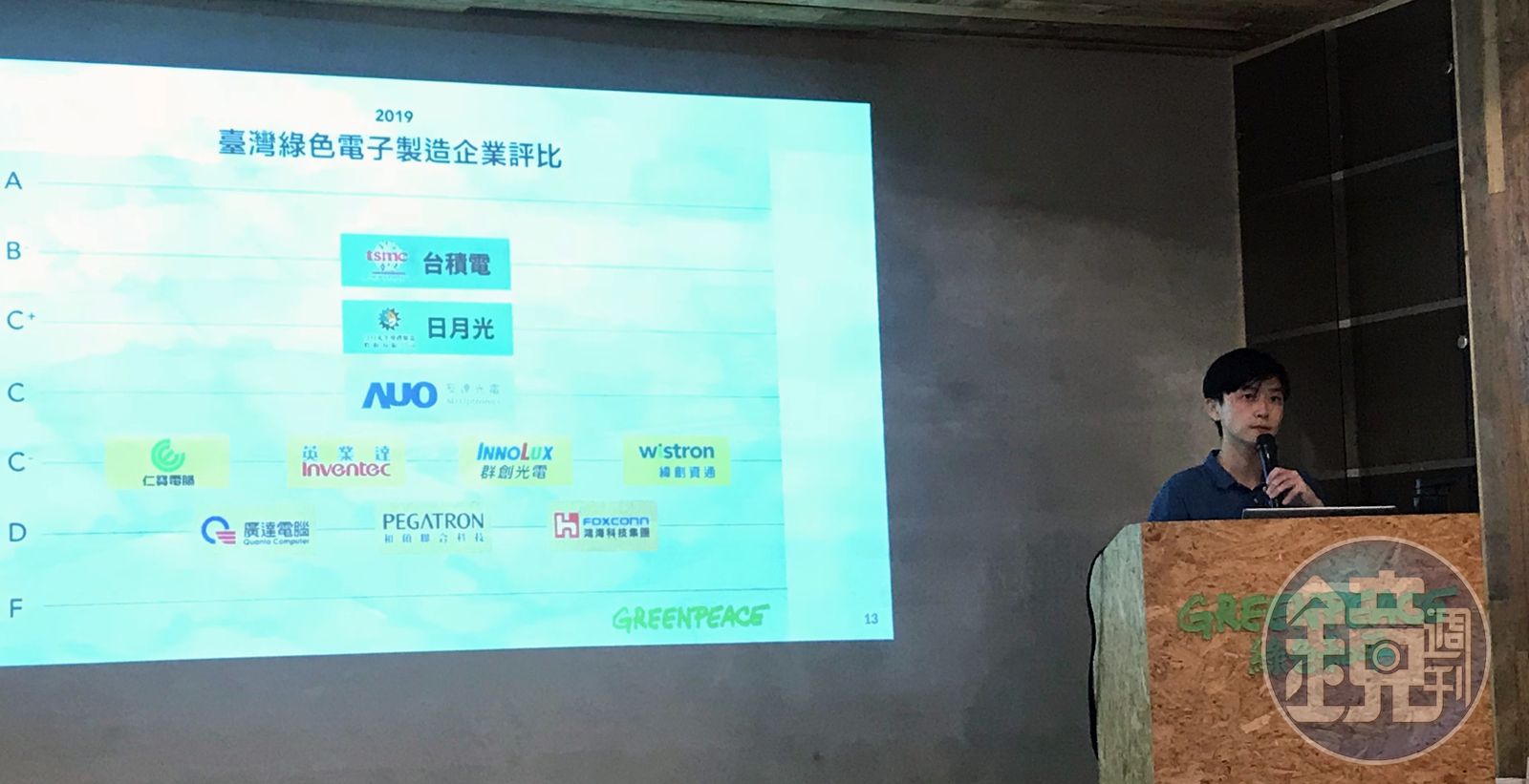 面對全球大力減碳的浪潮,綠能發展已成趨勢,我國政府與企業也積極投入減碳行列,綠色和平針對台灣前10大電子製造公司,分別為台積電、日月光、友達、仁寶、英業達、群創、緯創、廣達、和碩、鴻海進行「溫室氣體管理」及「再生能源使用」兩面相表現,以資訊公開、企業承諾、實際成效及倡議行動4項指標進行評比。