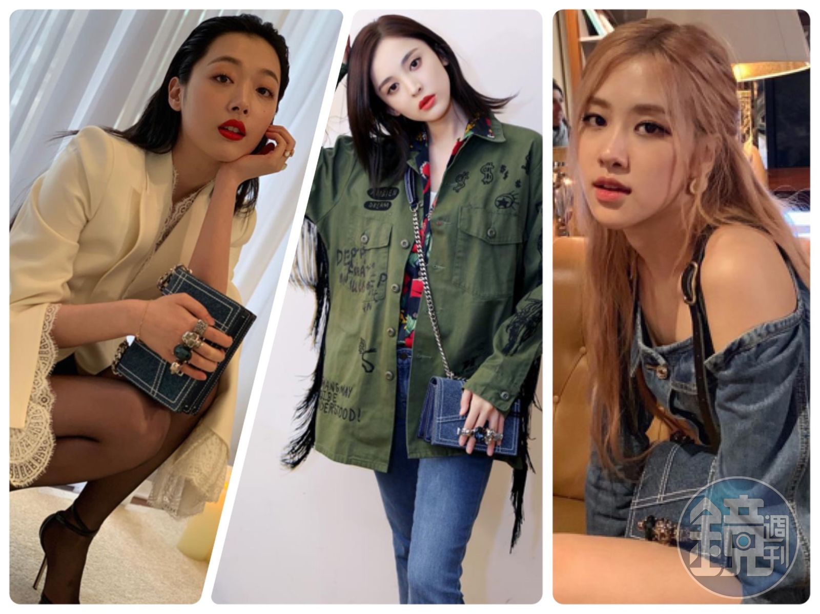 〈左起〉雪莉、古力那扎、ROSE,都以不同方式詮釋Alexander McQueen丹寧鑽石骷髏鍊帶包。〈MINOSHIN美之心提供〉發布時間:2019.05.31 18:16 臺北時間