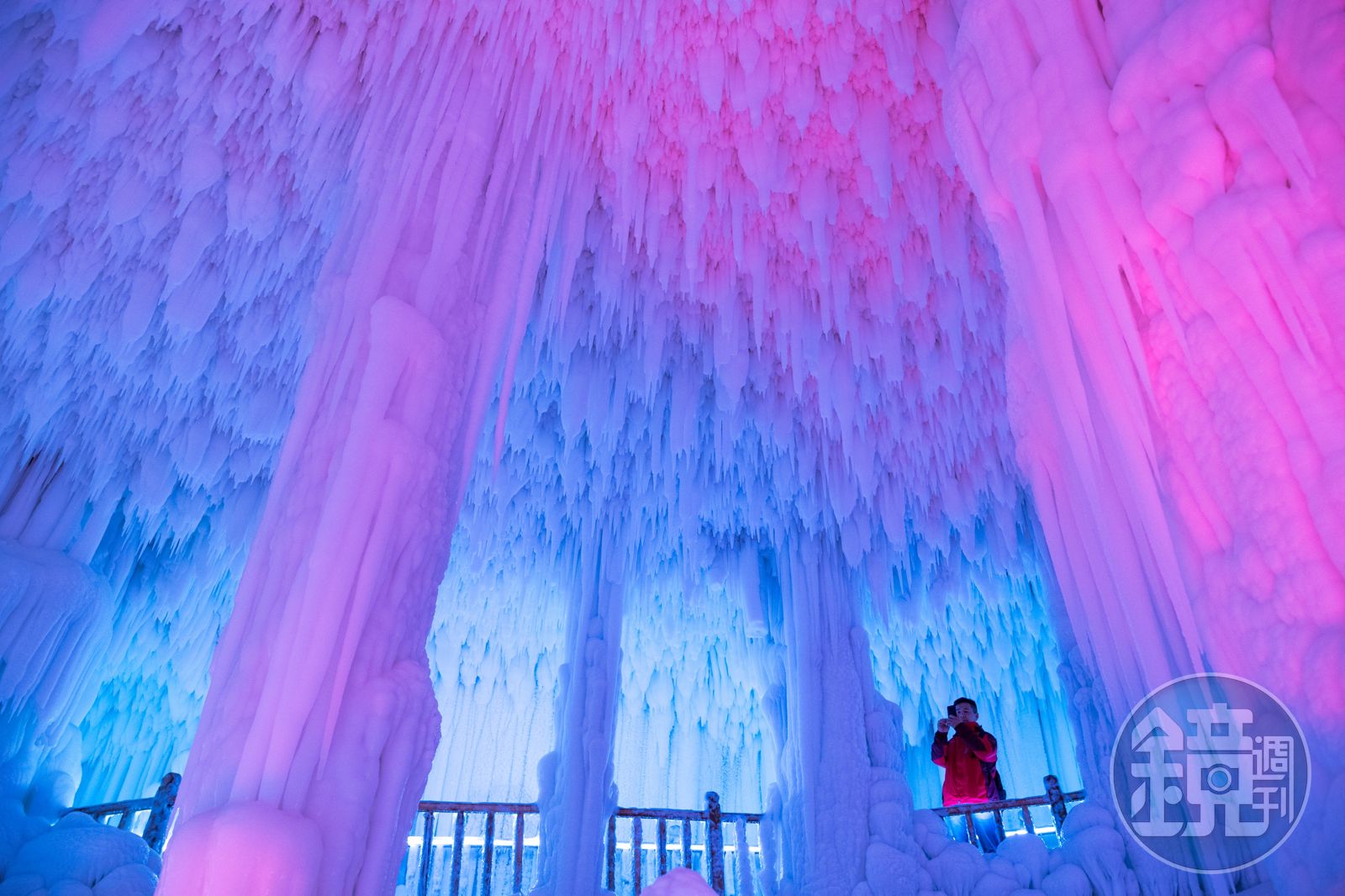 順著狹小通道再往前走,洞口突然變開闊,眼前景致就像是冰雪奇緣中的冰宮,四周各種形態的冰筍、冰錐、冰柱,在彩燈變化下顯得奇幻美麗。再往前走,有時走道上方會有尖銳冰柱逼近頭部,幸好比較危險的冰柱,現在大多已經磨平,工作人員也發給大家安全帽以策安全。