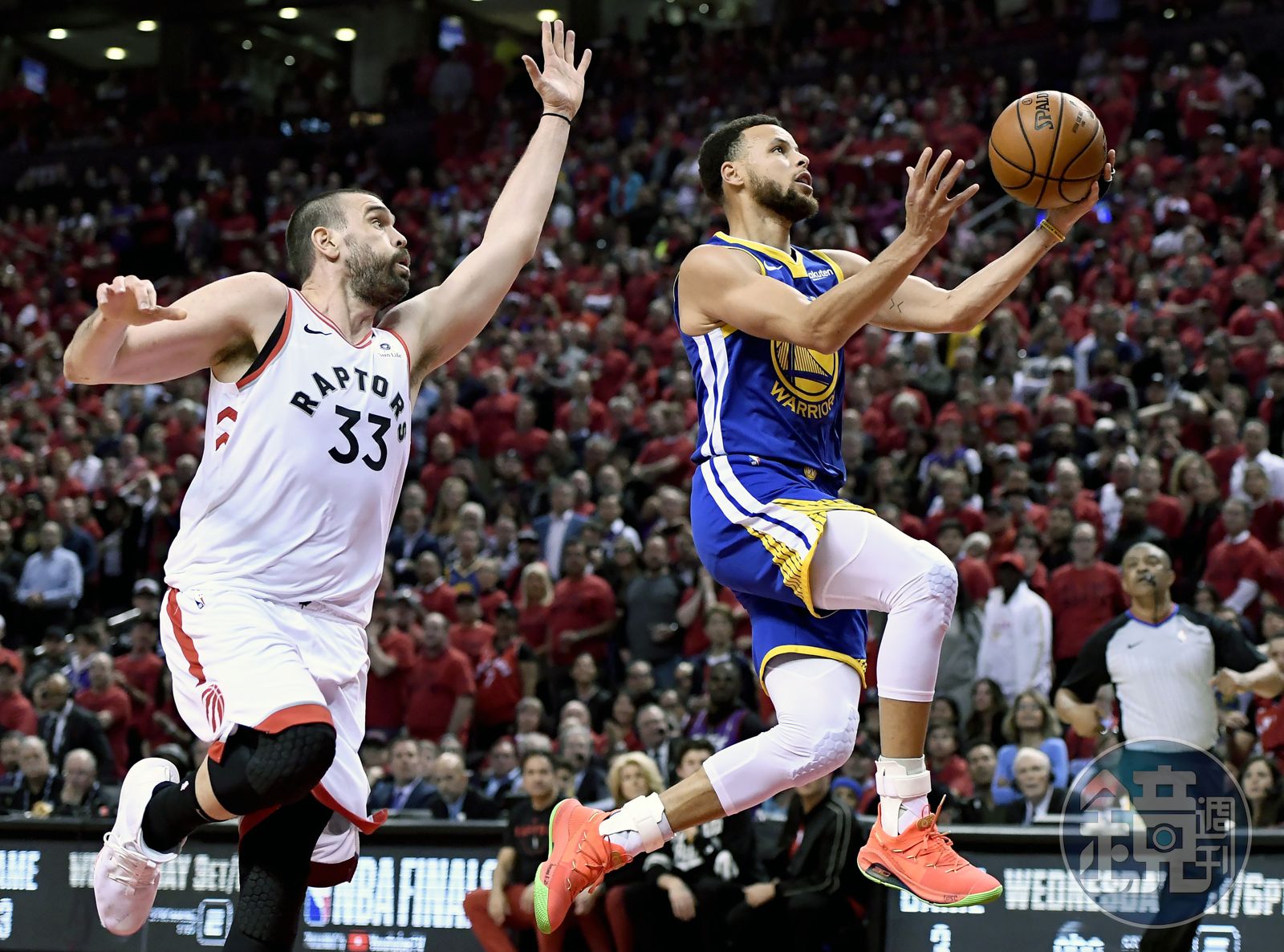 上一役勇士缺少主力「KD」杜蘭特(Kevin Durant),加上暴龍火力大爆發,最終在客場吞下系列戰首敗。此役勇士同樣持續作客加拿大,首節開打暴龍再度展現凶猛攻勢,加上「咖哩」柯瑞疑似身體不適,打完第一節暫時回到休息室,勇士以26比27緊追在後。