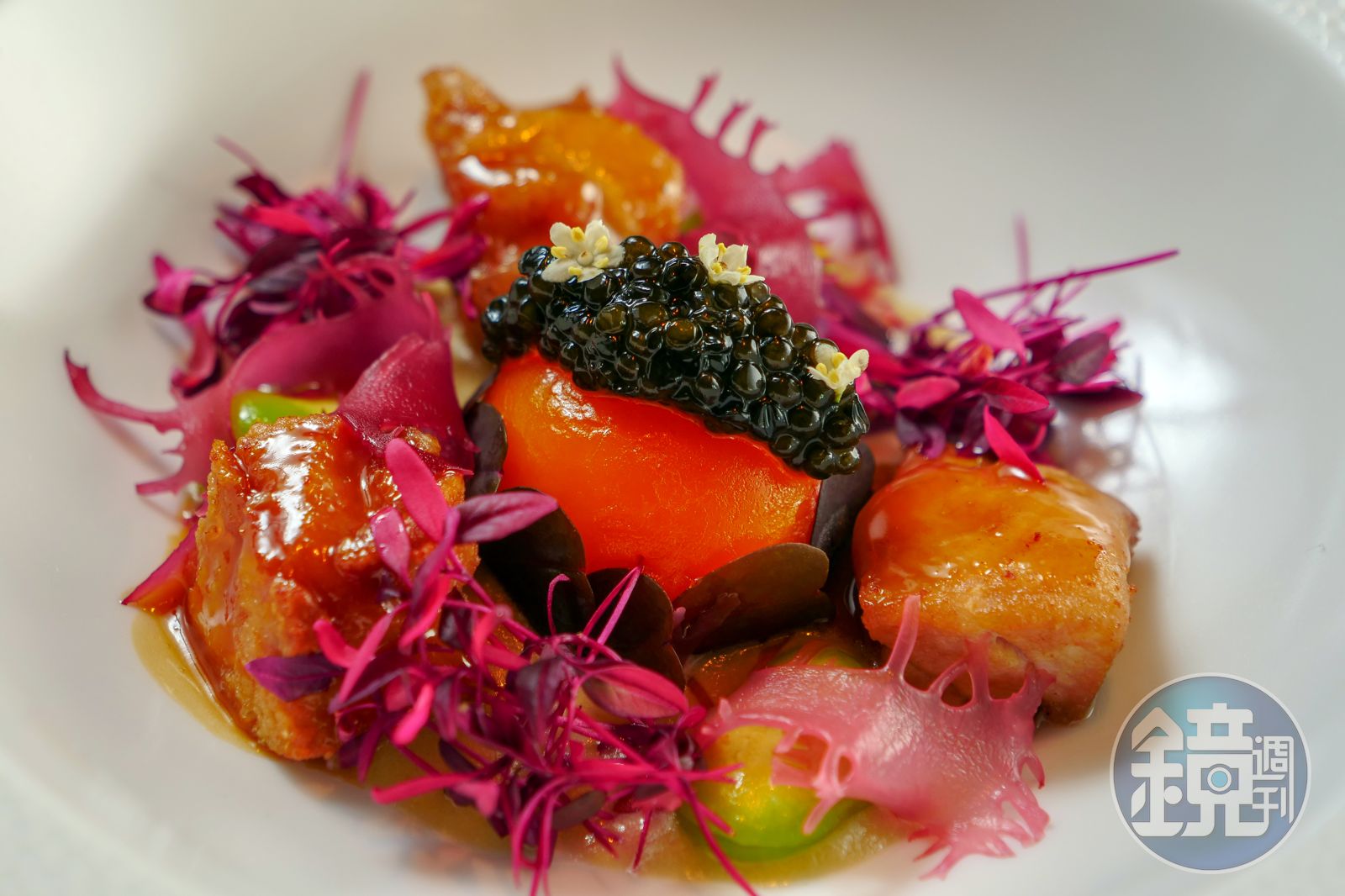 相同食材交到義菜主廚雅克柏手裡,他把小牛胸腺採舒肥低溫烹煮再烤過,效果是外皮澎潤金黃,口感柔軟,搭配鮮鹹的魚子醬和蔬菜,用新派料理語言重新解釋老食材。