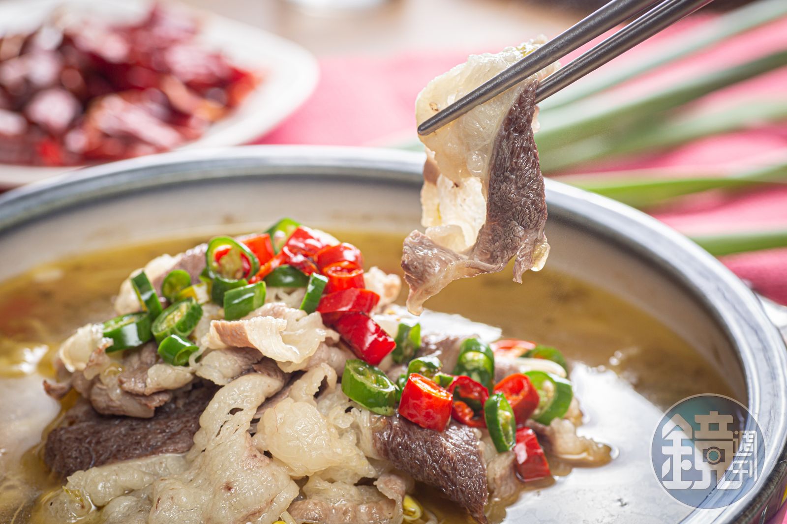 裝在海碗裡的湯菜「缽缽鮮」,把魷魚、牛百頁、黃喉、馬鈴薯片、蓮藕、玉米筍、青花菜泡在冰雞湯裡,淡黃藤椒油浮在湯面,未嘗暑氣先消泰半。入嘴先覺湯的冰鮮、食材的脆,其後藤椒的威力才慢慢湧現,嘴唇有如裝上低週波治療器般陣陣爽麻,味覺則因麻而更加銳利,鮮酸甜鹹辣都被放大,是很過癮的一道菜。