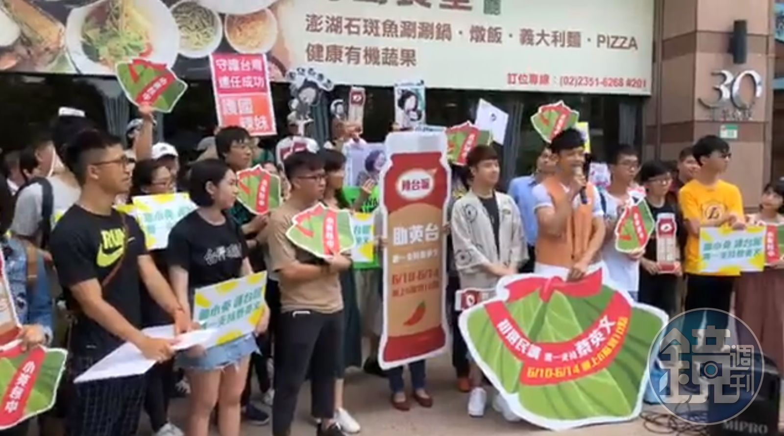 蔡英文支持者今天集結民進黨中央黨部前,發動「助英台」行動,呼籲端午節返鄉的遊子,能說服家中長輩在電話民調中挺小英。(翻攝自焦糖陳嘉行Brother Caramel臉書)發布時間:2019.06.05 19:14 臺北時間