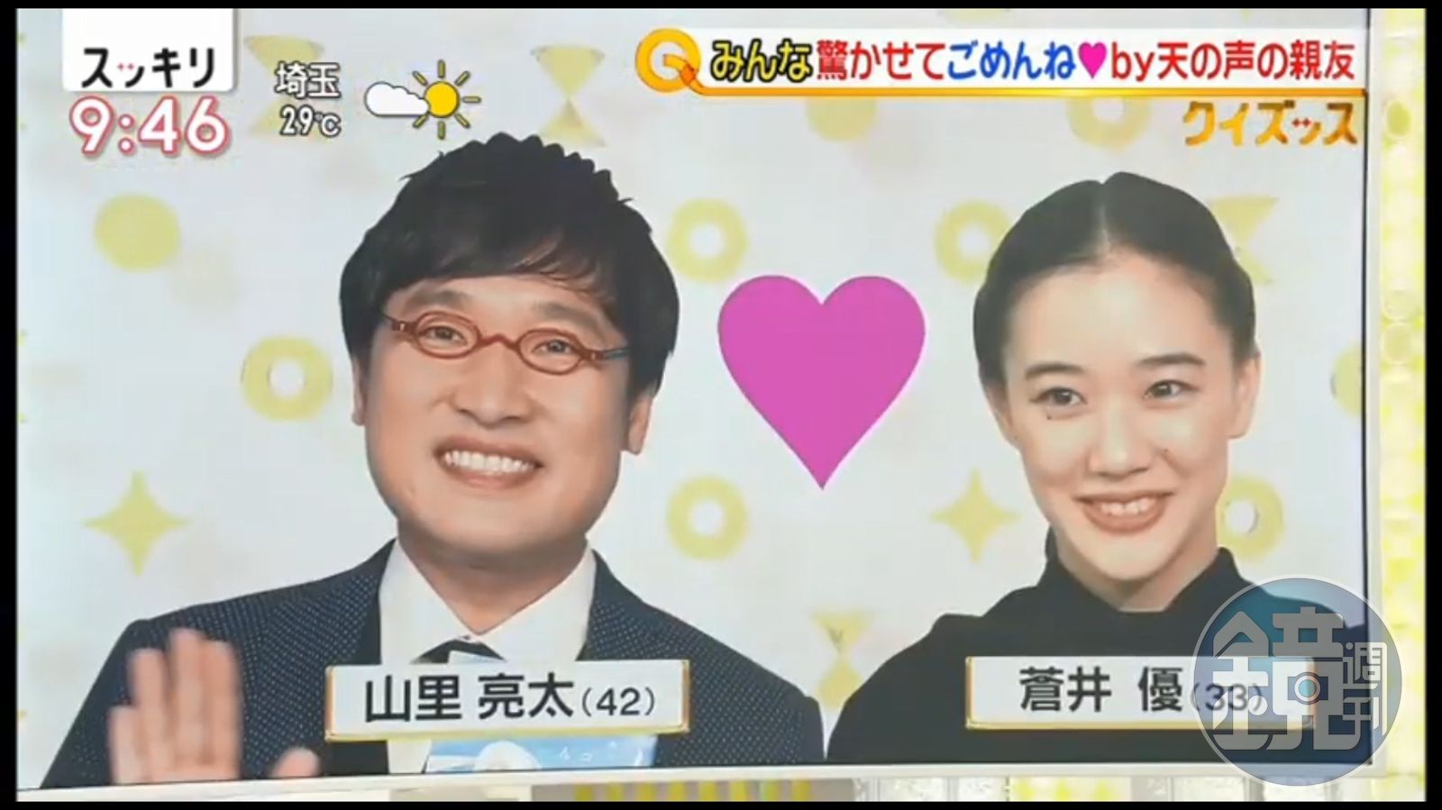 沒想到如今山崎靜代卻成為這對夫妻之間的月老,今年年初,山里亮太也說自己走桃花運,不但社群網站有巴西女生努力想要接近她,而且加上蒼井優的「尊敬」,搞不好自己會冠妻姓叫「蒼井亮太」,當時一句玩笑話已經悄悄預言。此外,夫妻兩人今晚(6月5日)即將召開記者會宣布喜訊。