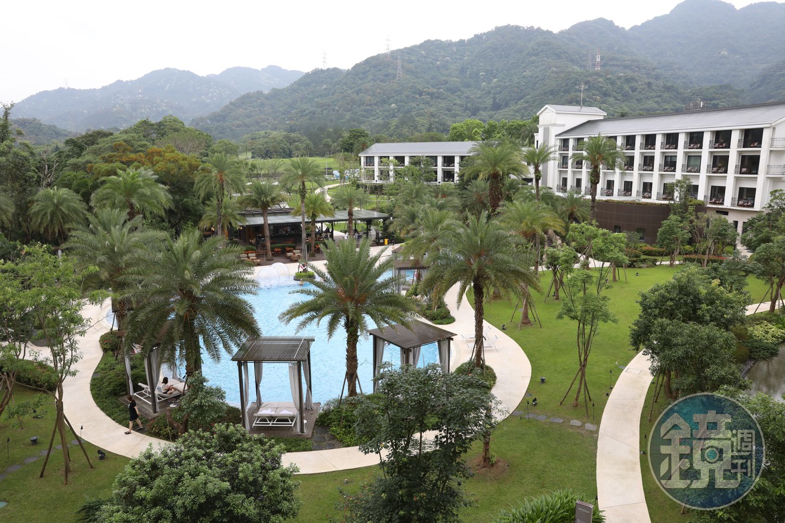 整個度假村洋溢著有如置身東南亞的輕鬆氛圍,戶外泳池區的白色休息亭、周圍的棕櫚樹與藍色的泳池,則是網紅們最愛拍照的區域,泳池還提供水上漂漂球及獨木舟可供玩樂。戶外的結婚廣場,放了一座木造的鏤空教堂,也是匠心獨具。