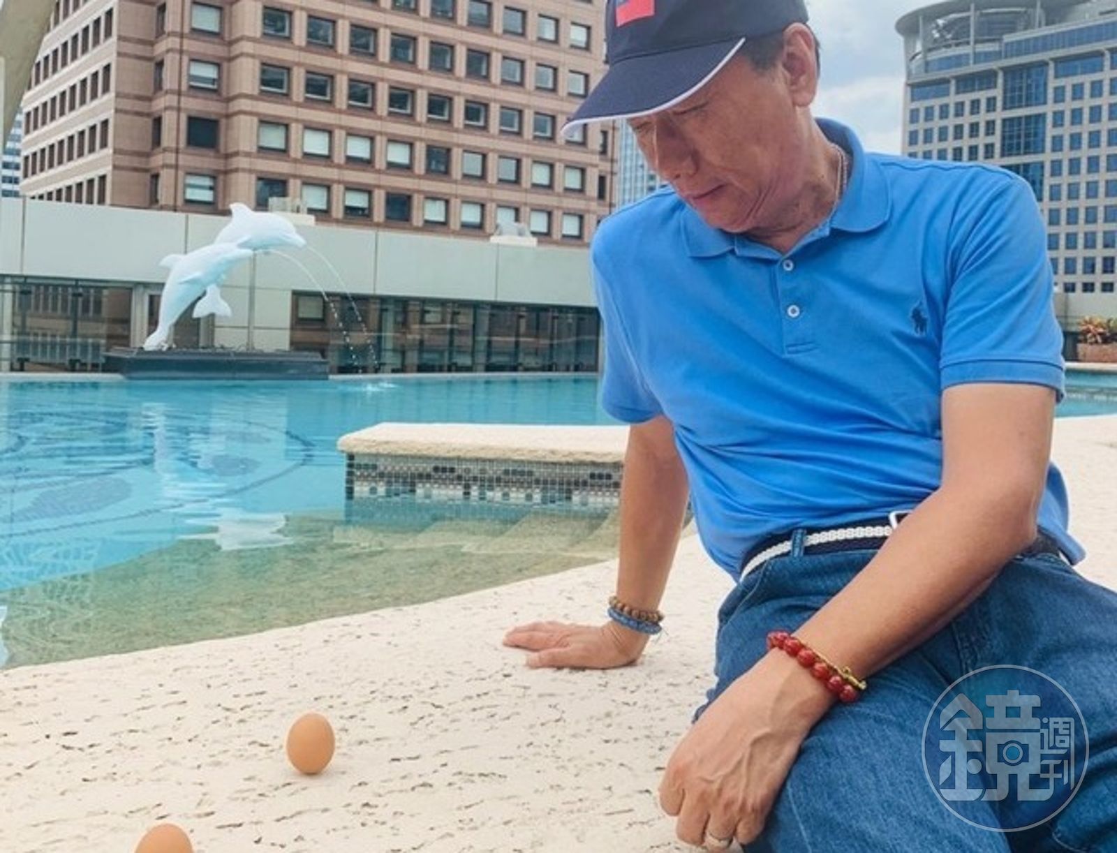 而郭台銘下午也應景的在Line帳號秀出端午立蛋照,只見他身著藍色polo衫,頭戴國旗帽坐在噴水池旁,雙眼則注視著水池邊上的兩顆成功立起的雞蛋,他表示自己畫了快10分鐘才立蛋成功,開心請大家一起挑戰。