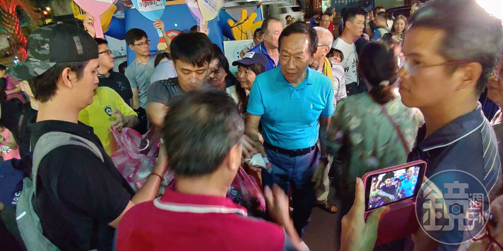 郭台銘出現後先到市的遊客服務中心和當地人士見面,並了解整個夜市的運作情況,隨後,郭台銘在其工作和安全護衛人員的保護下進入到夜市,並和攤商親切的寒暄、問好,對於攤商或是逛夜市民眾的合照要求,郭台銘是來者不拒,一一滿足民眾的需求,甚至有時還會主動的抱起小朋友和其及家人合影,展現十足的親民作風。