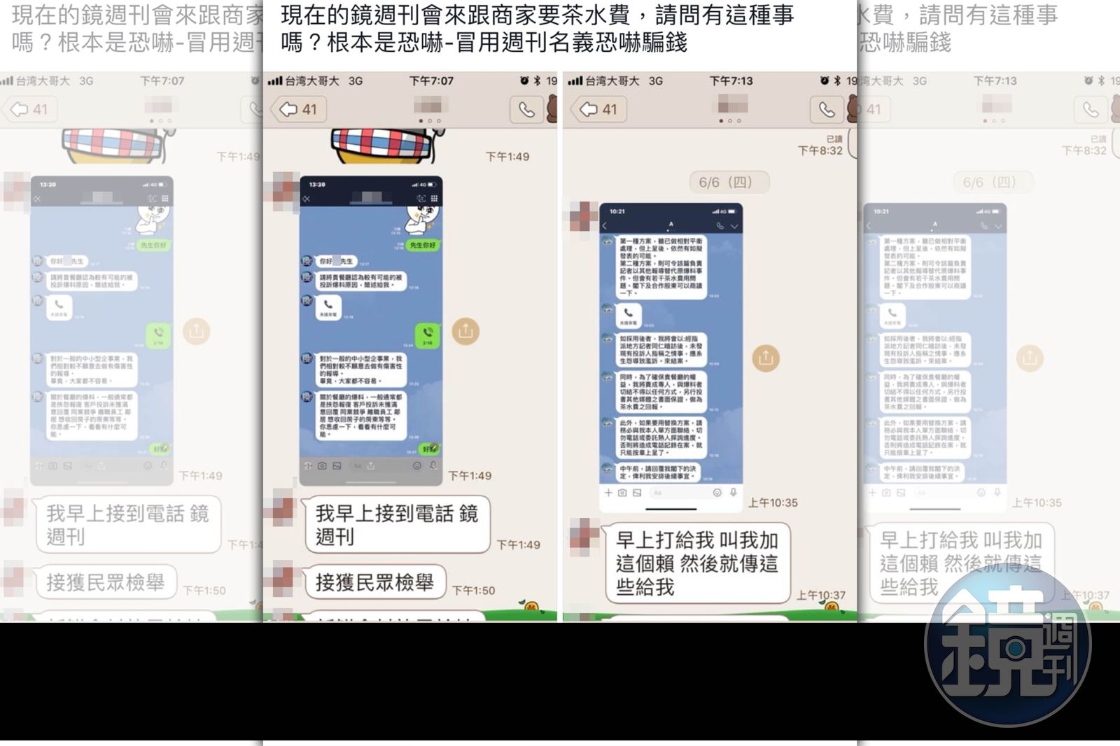 今年6月4日,本刊接獲1名餐飲業者的查證電話,指有自稱《鏡週刊》記者的人要求加入Line好友,然後向業者表示,《鏡週刊》接獲投訴,指該店衛生狀況有問題,是黑心廠商,如果願意支付「茶水費」,就不會報導。