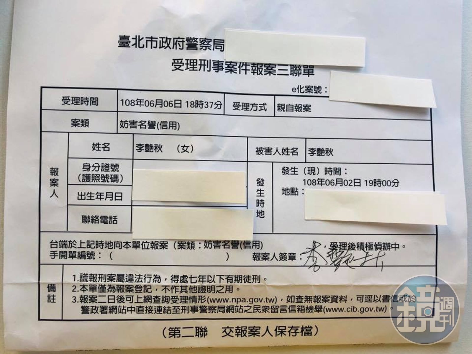 李艷秋在臉書上貼出報案三聯單,她告的這位網友是女性,是參加韓國瑜凱道造勢的真韓粉,這位網友多次在她臉書留言,指她拿了郭台銘的錢,所以幫郭抬轎。李艷秋表示,「指控一名新聞人拿錢捧人,是絕大的羞辱,我的新聞生涯中,絕不容許有任何人、用任何方式對我做這樣毫無證據的羞辱!」