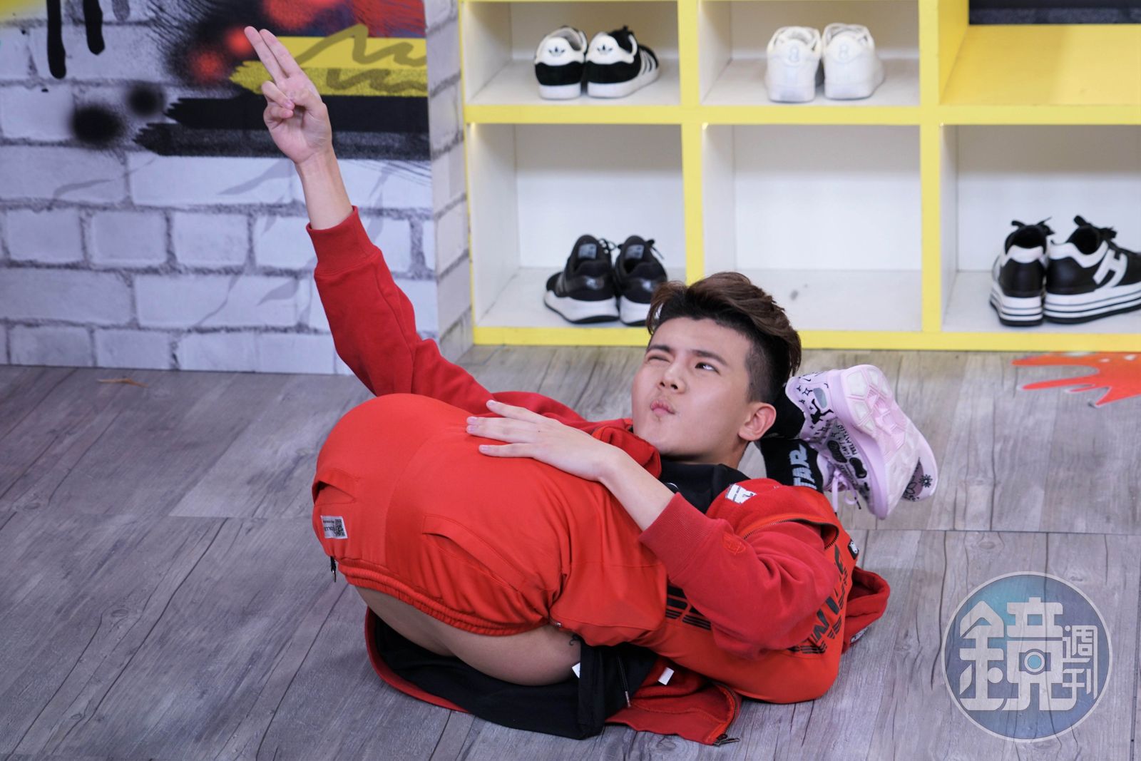 當音樂一下,孫生立刻跳起舞,並以超荒謬的「大法師」軟骨功做Ending pose,將雙腳扣住脖子在地上旋轉,笑說:「哥,這你一定做得到,我們家都這樣幫自己檢查痔瘡啊!」