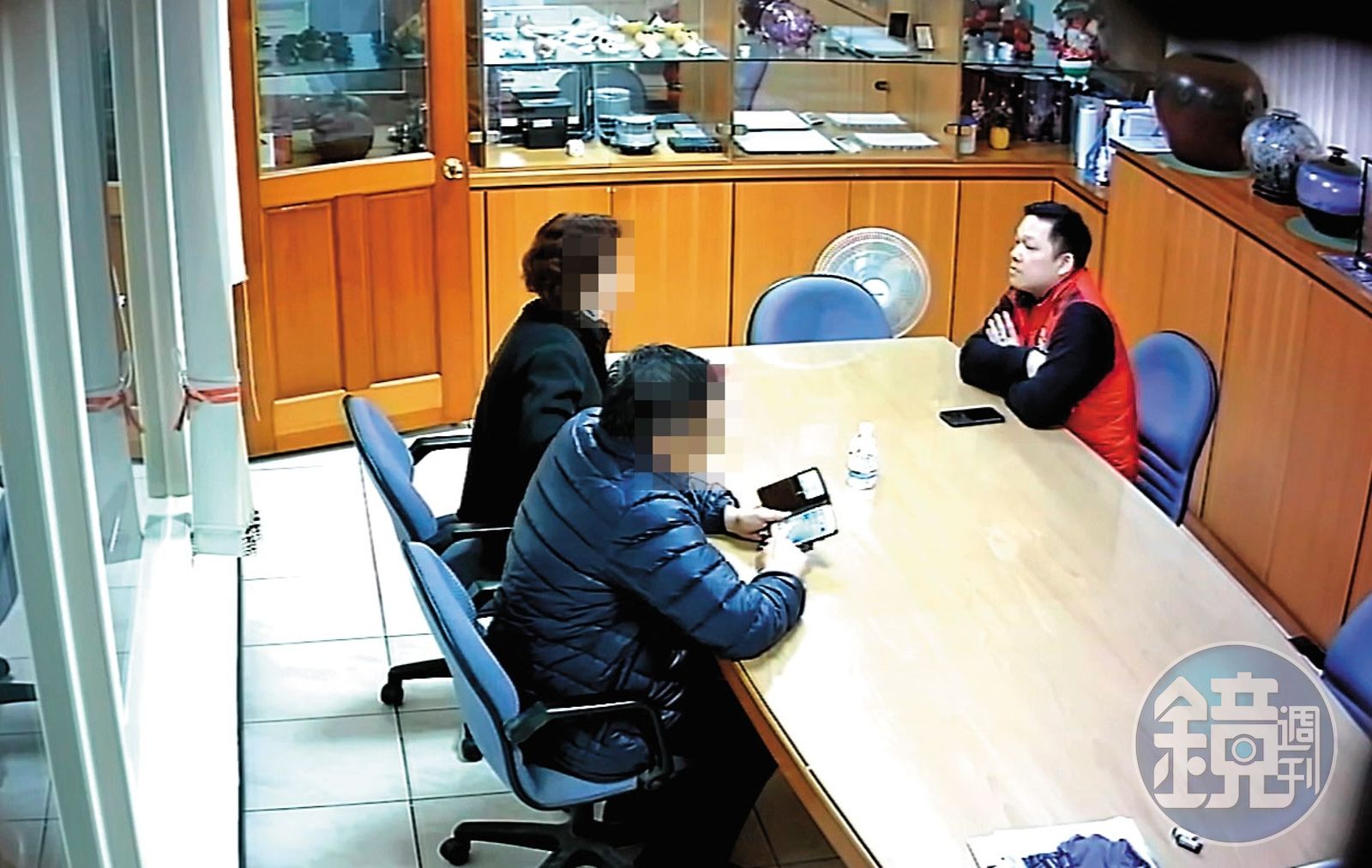 桃園平鎮一間塑膠公司因廠房擴建與包商發生糾紛,簡漢武(右)自稱是包商股東上門「協調」,但被害人之前根本沒看過他。(翻攝畫面)發布時間:2019.06.12 05:58 臺北時間
