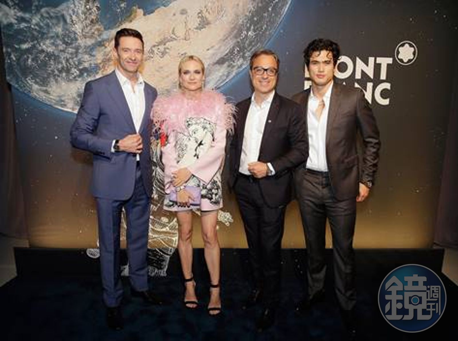 萬寶龍全球品牌大使休傑克曼(左起)、萬寶龍總裁Nicolas Baretzki、好萊塢女星黛安克魯格和男星查爾斯梅爾頓。(萬寶龍提供)發布時間:2019.06.13 13:09 臺北時間