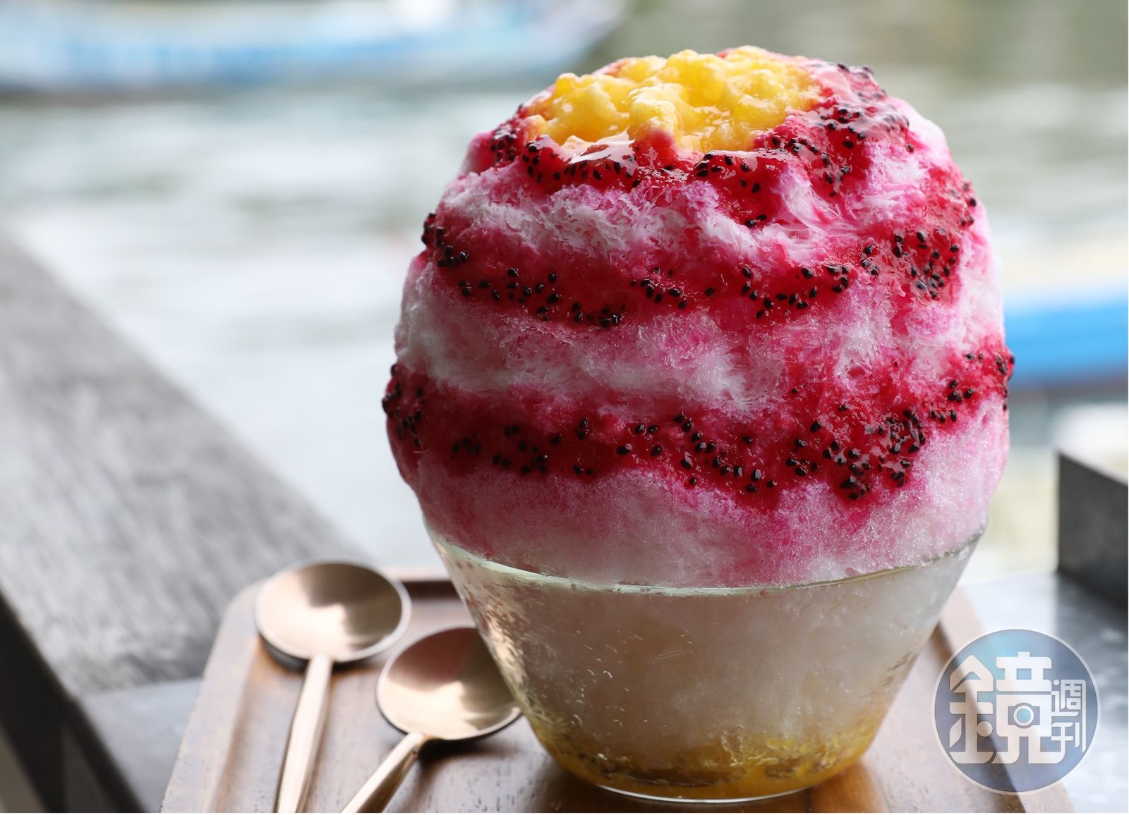 於是,夏日限定的「淡水夕日」,淋上親手熬煮的火龍果醬與芒果醬。「ESPUMA宇治金時」則覆上具有空氣泡沫感的抹茶醬,茶香濃郁,愛吃甜的可再搭配煉乳,與底層的紅豆及白玉是經典絕配。