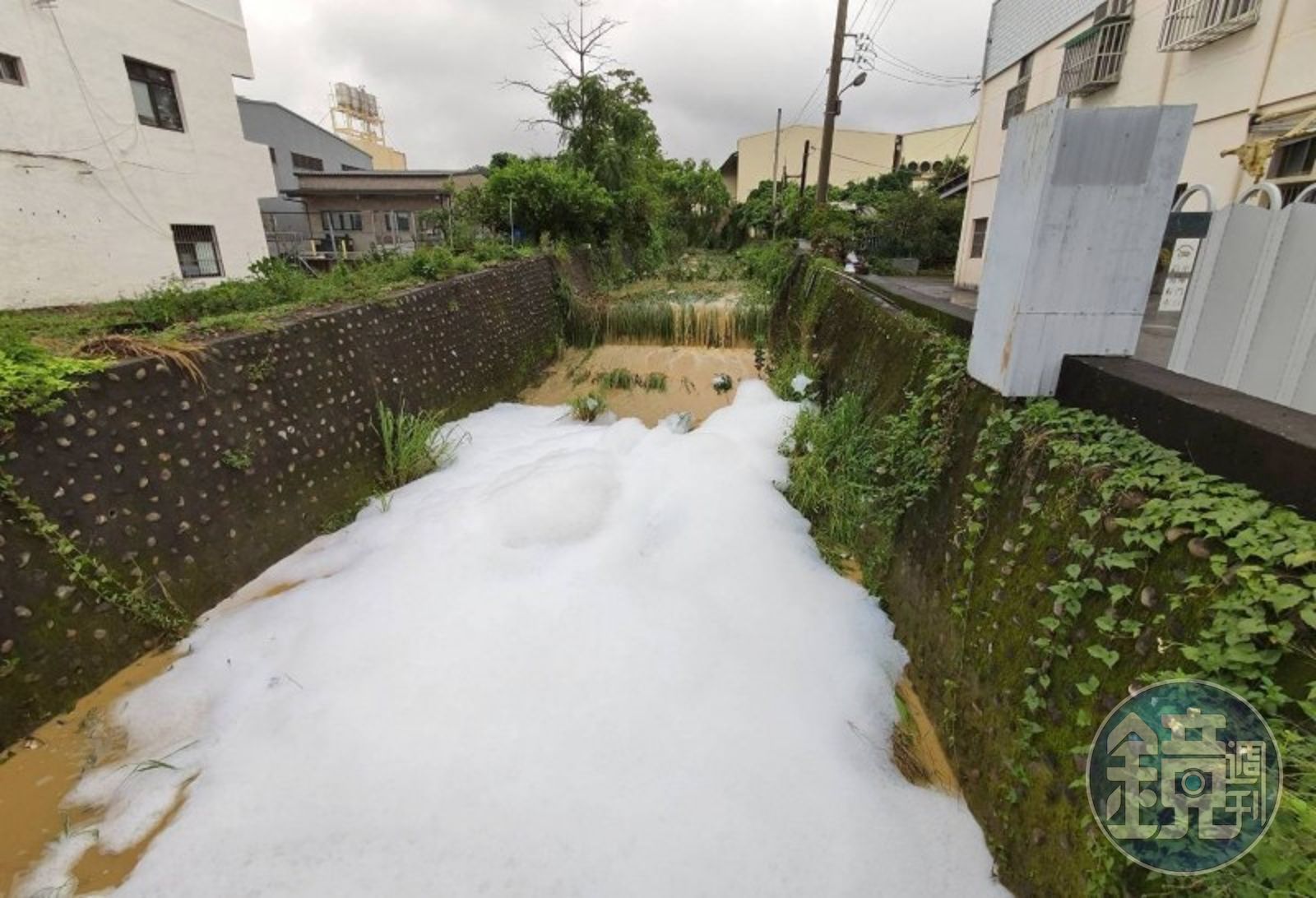 連日豪雨來襲,一直到昨天傍晚雨勢才稍微減緩,位於彰化縣大村鄉、員林市交界的「大樹坑大排」罕見的水位高漲,詭異的是,從昨(13日)下午3點起,大排上游不斷流下白色泡沫,而且泡沫會膨脹、泡泡隨風飄,飄到民宅,漂到岸上,雖然沒有刺鼻的臭味,但有濃濃清潔劑人工香精的味道,附近居民連忙向縣議員曹嘉豪陳情,他也連忙請環保局稽查人員會同到現場勘查。