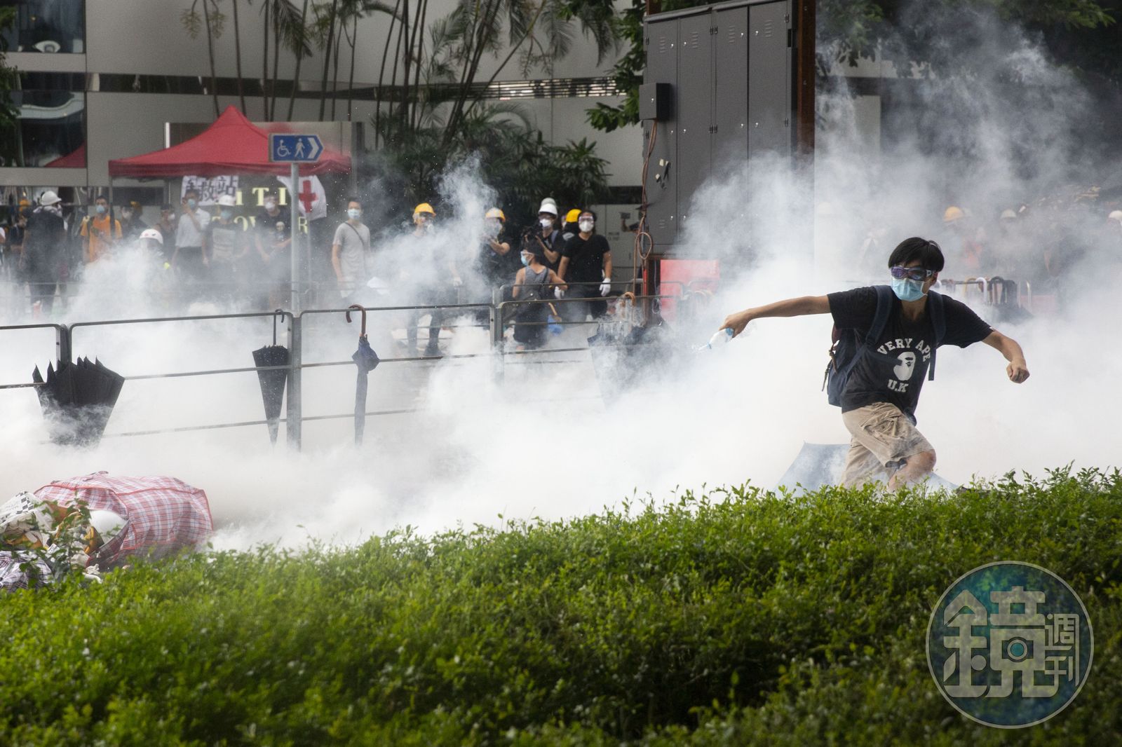 遠處,一發又一發的催淚彈射出,風來了,煙霧過來了,我跟著抗議民眾快速後退,眼淚與鼻水像止不住的水龍頭,生理反應要你離開。但煙霧一過,抗議民眾又一波一波往前,退兩步、便再前進一步,直到大批抗暴警察追上來,大家才倉皇奔逃,滿坑向民眾募集來、學生接力送進來的物資,來不及取走。