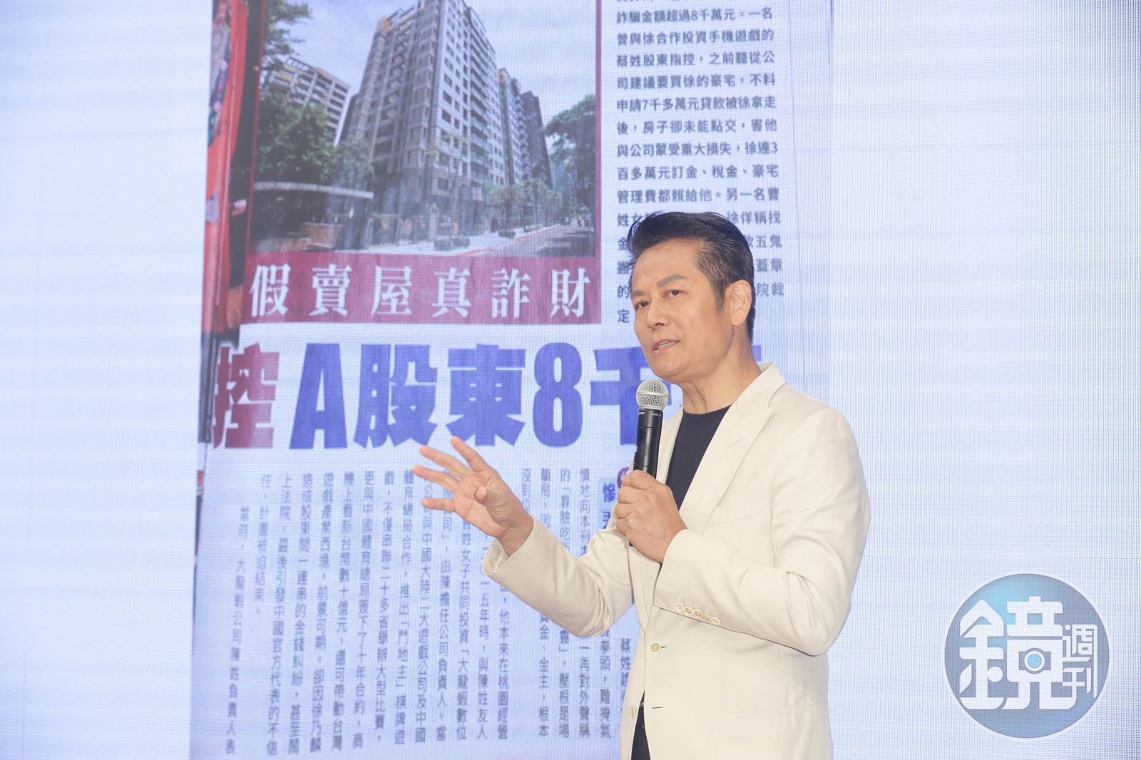 整場記者會乃哥除了秀出雙方房屋過戶的相關文件、契約書、匯款單等,還有當時媒體的影音報導當作佐證。但是裡頭赫然出現三立新聞台的《54新觀點》節目,是已過世的名嘴劉駿耀,當年採訪楊小姐的錄影。以及記者會最後一段,秀出了電話錄音,是徐乃麟自己跟詐賭案涉案人強尼(許先生)的對話,以證實自己清白。
