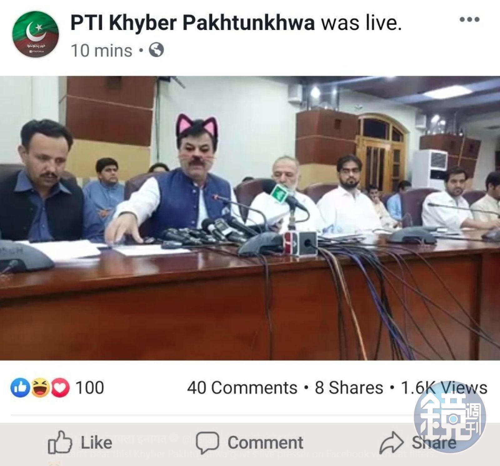 巴基斯坦開伯爾-普赫圖赫瓦(Khyber-Pakhtunkhwa)地方政府,日前用臉書進行直播,沒想到直播人員竟忘記將濾鏡關閉,導致尤薩夫贊(Shaukat Yousafzai)等官員都變身「喵星人」,搞笑畫面在社群上瘋傳,也登上各大媒體版面。